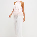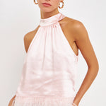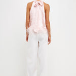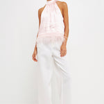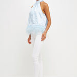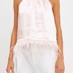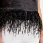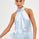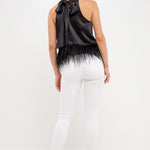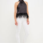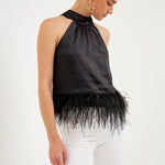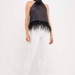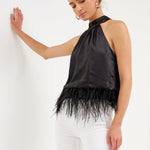 Add some beauty to your wardrobe with our Feather Trim Top. This top is perfect for special occasions, including holiday parties, date nights, business dinners, and many more. The halter silhouette and feather trim embody old Hollywood glamour in a modern way.