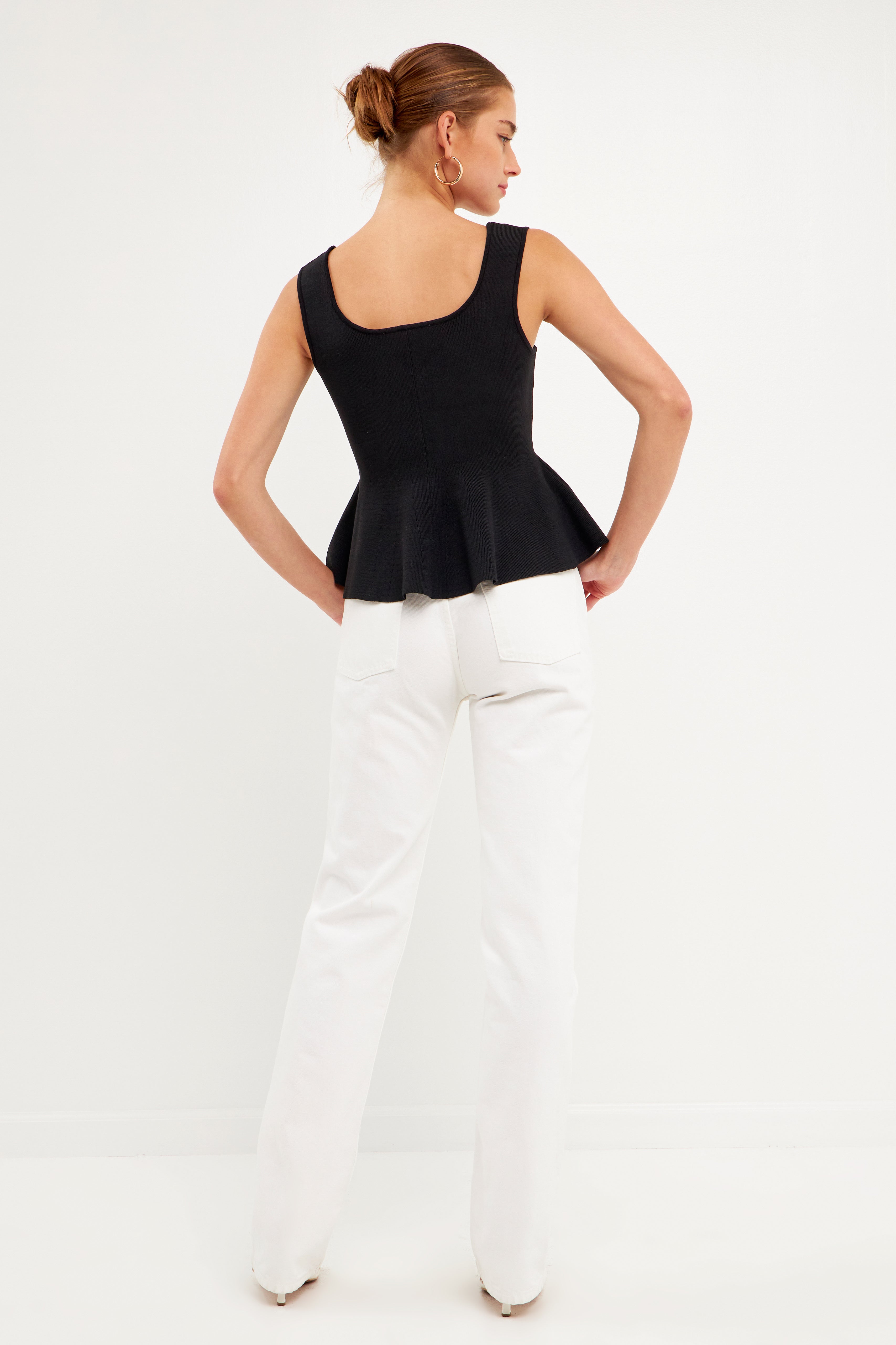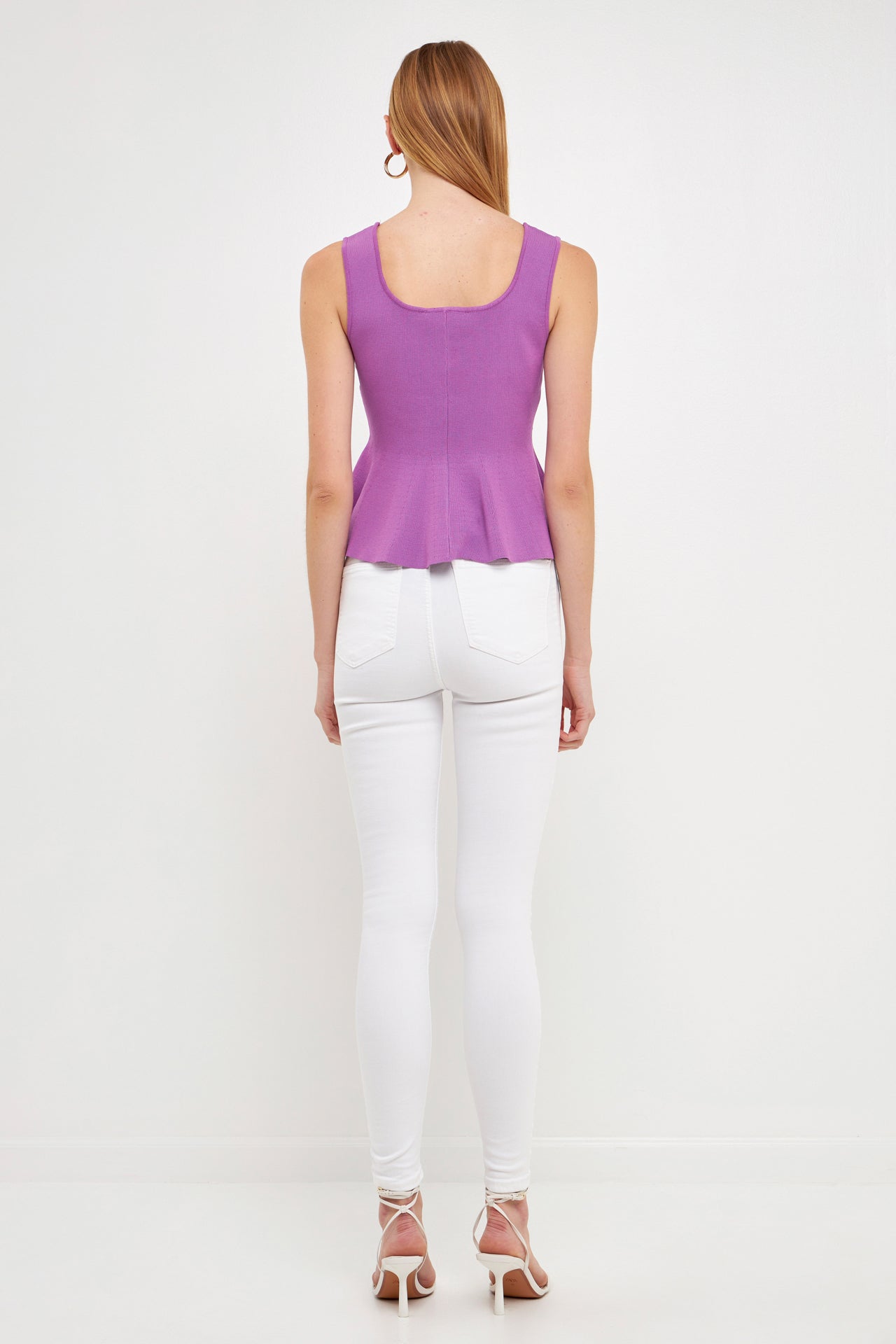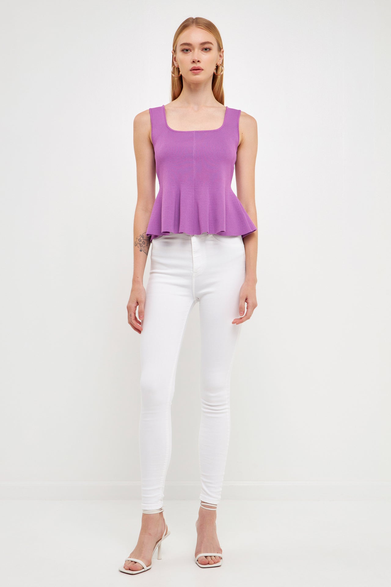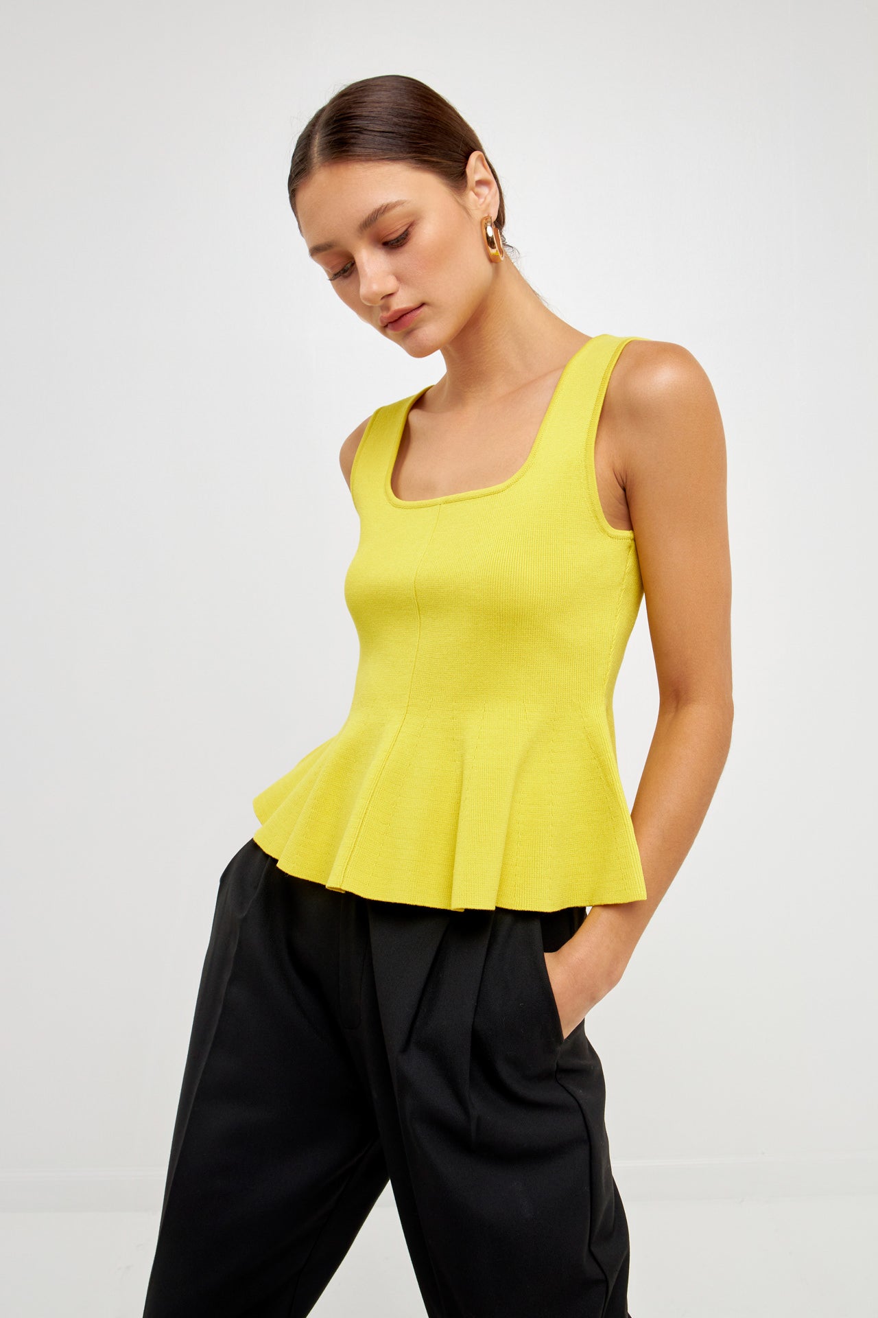 This tank top is sure to turn heads with its unique flare detail. With a flattering square neckline and pretty peplum, this top is perfect for a day or night out. It's also sleeveless, so you'll stay cool on those hot summer days. This top is perfect for dressing up or down. So whether you're grabbing coffee with friends or going on a date, this top will have you looking your best.