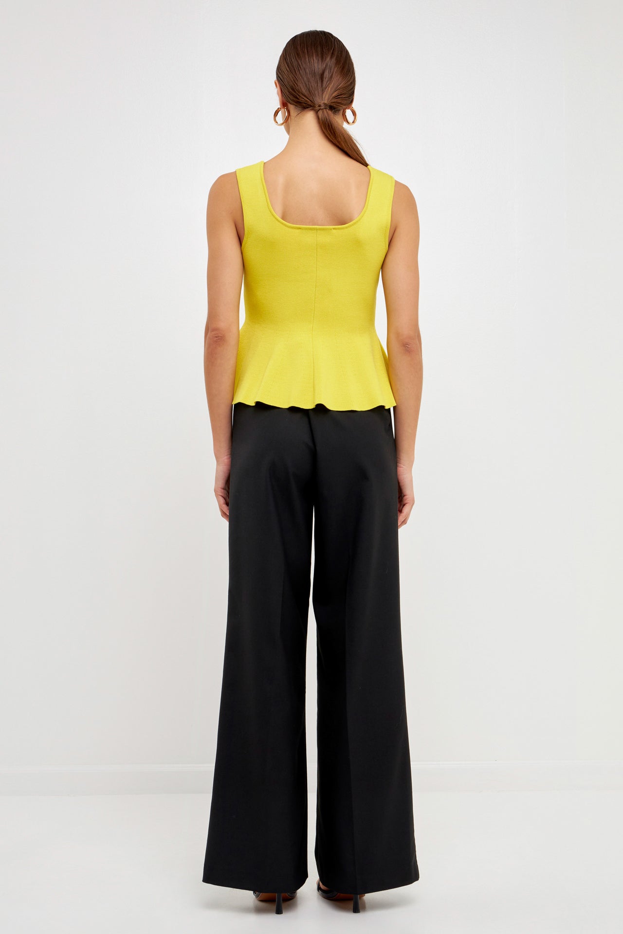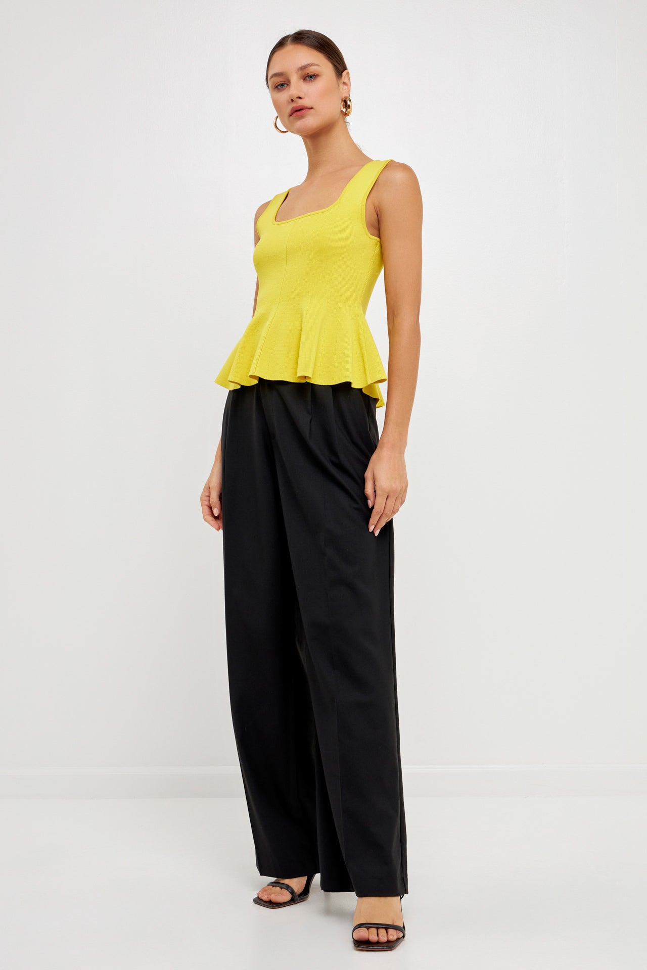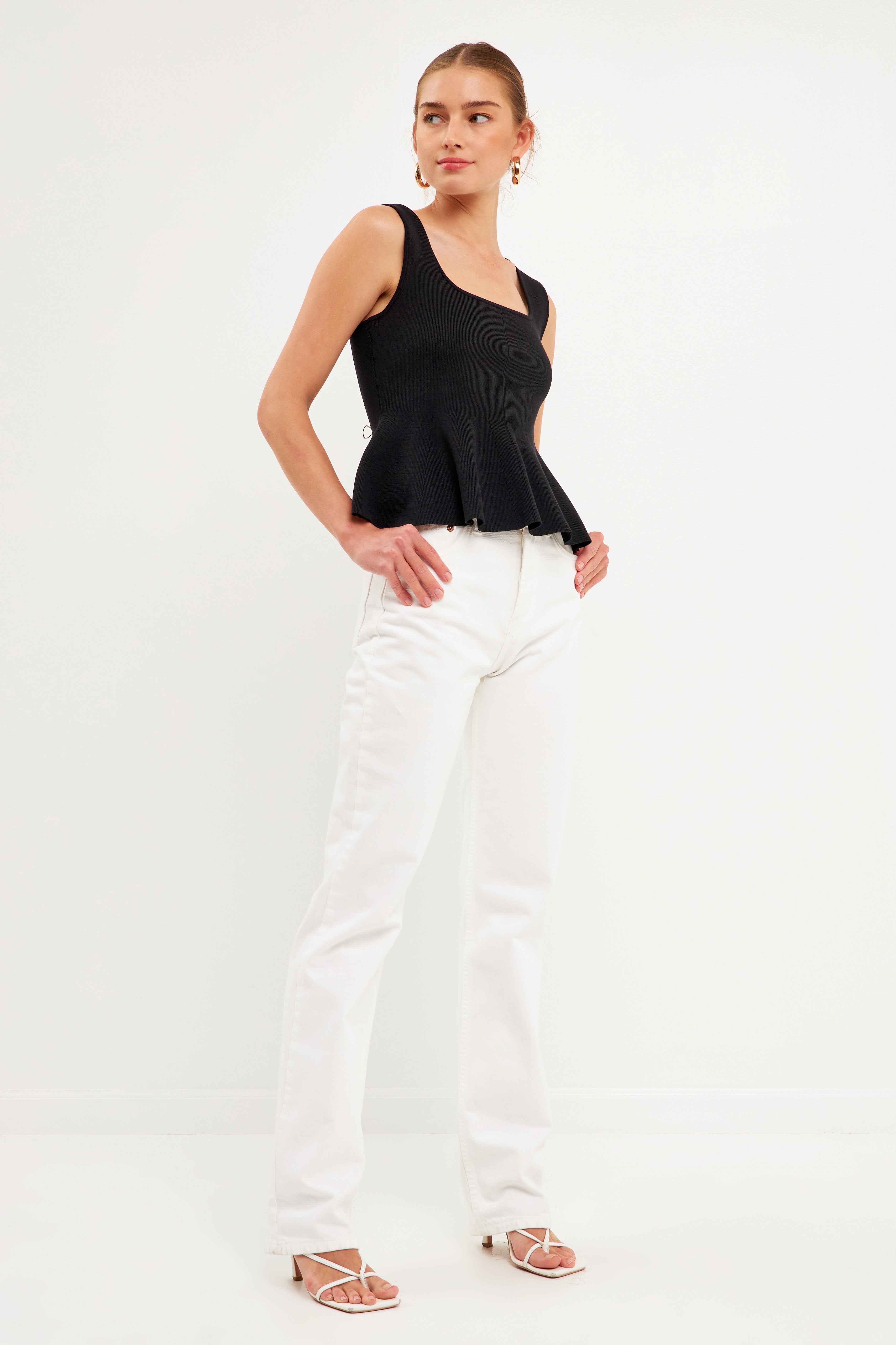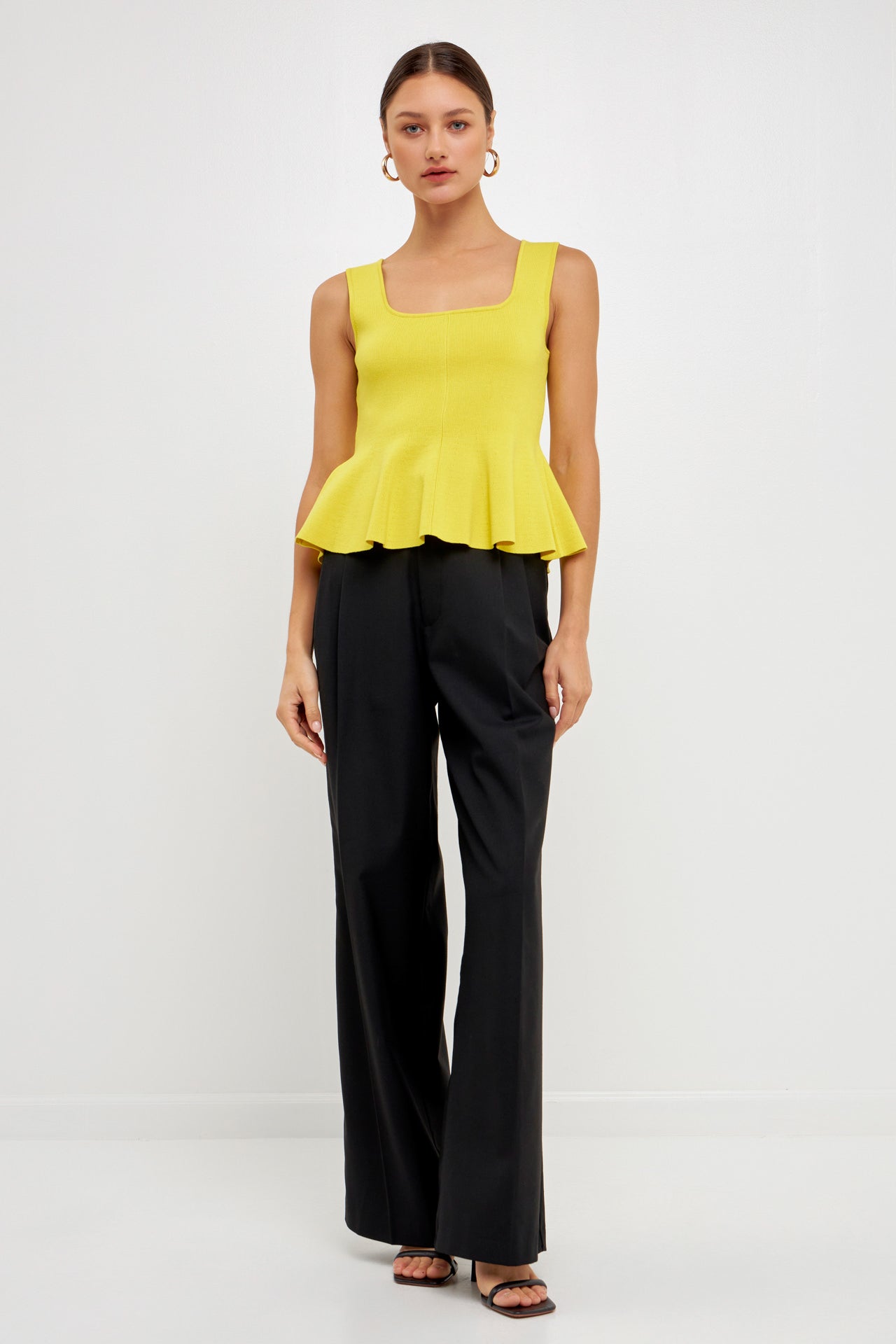 This tank top is sure to turn heads with its unique flare detail. With a flattering square neckline and pretty peplum, this top is perfect for a day or night out. It's also sleeveless, so you'll stay cool on those hot summer days. This top is perfect for dressing up or down. So whether you're grabbing coffee with friends or going on a date, this top will have you looking your best.