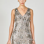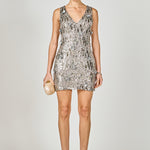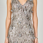 The Floral Appliqué Sequin Mini Dress blends delicate femininity with bold sparkle. Floral appliqués add texture and charm, while sequins catch the light for a playful, glamorous effect. The sleeveless V-neck silhouette flatters your figure, making this mini dress perfect for parties, nights out, or any occasion where you want to stand out.
