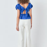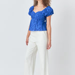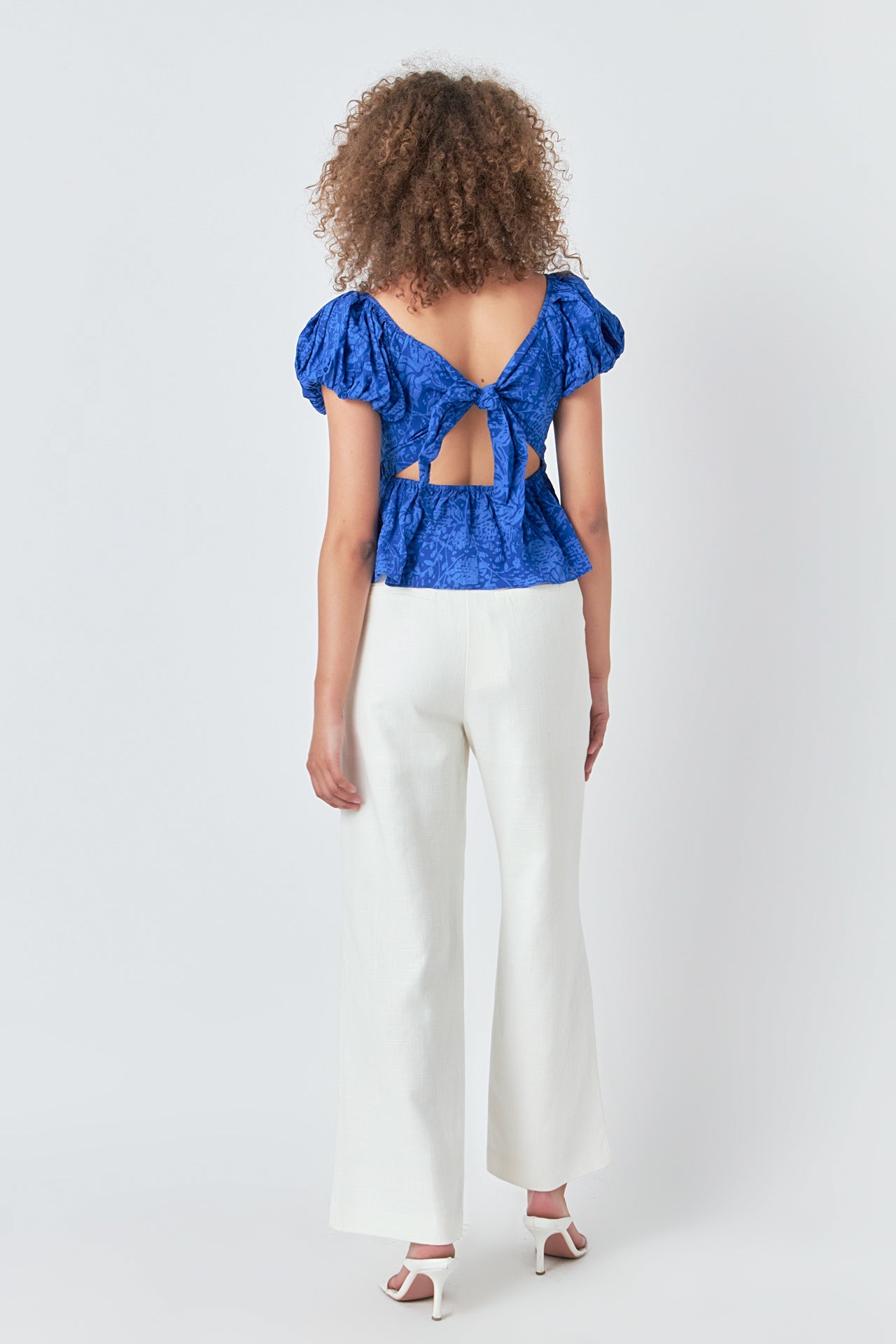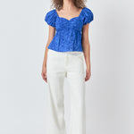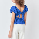 The sweetest way to top off your look. This woven floral top is feminine and sweet with a touch of flirtation. With its short puff sleeves and darling details, this top will have you looking elegant for any occasion. We love the off-shoulder style which gives a peek of skin, while the back tie detail adds just the right touch of intrigue.