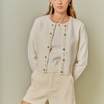 Our Floral Detail Cardigan is a refined layering piece designed to add subtle interest to any outfit. Featuring a classic round neckline and delicate floral detailing, it brings a polished finish without feeling overly formal. The front hook-and-bar closure creates a clean, streamlined look, while the long sleeves offer comfortable coverage. Easy to style over dresses or paired with denim, this cardigan is a versatile staple for everyday wear.