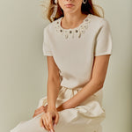 Our Floral Detail Short Sleeve Sweater is an easy way to add interest to your everyday knitwear. Designed with a classic round neckline and subtle floral accent. The short sleeves make it ideal for layering or wearing on its own, while the soft, high-quality fabric keeps it comfortable throughout the day. Finished with a simple pull-on design, this sweater is a versatile piece that works for both casual and dressed-up styling.