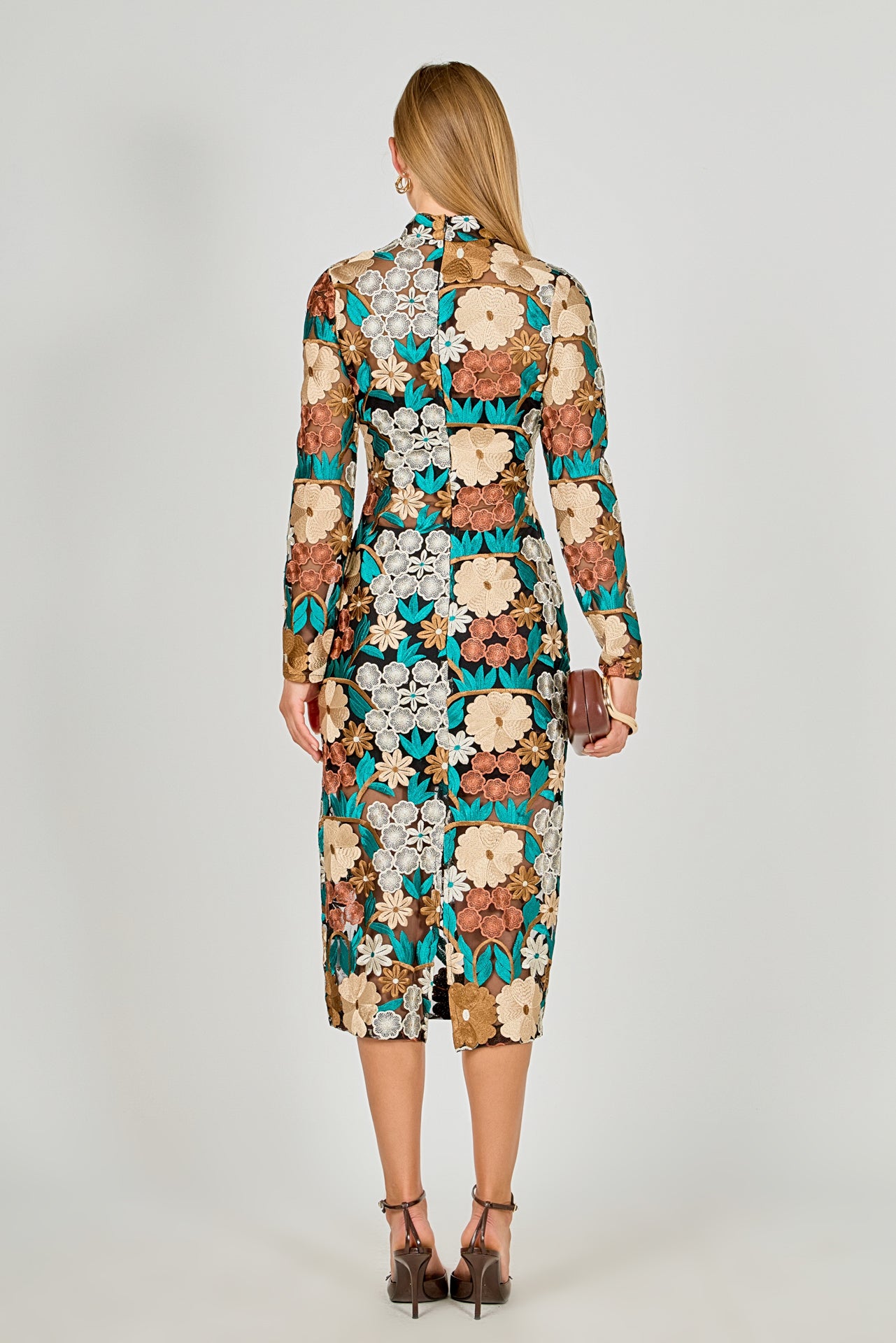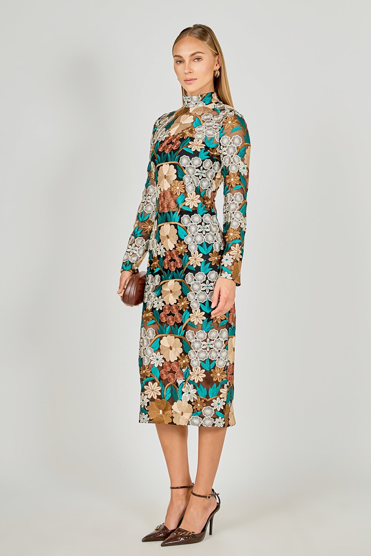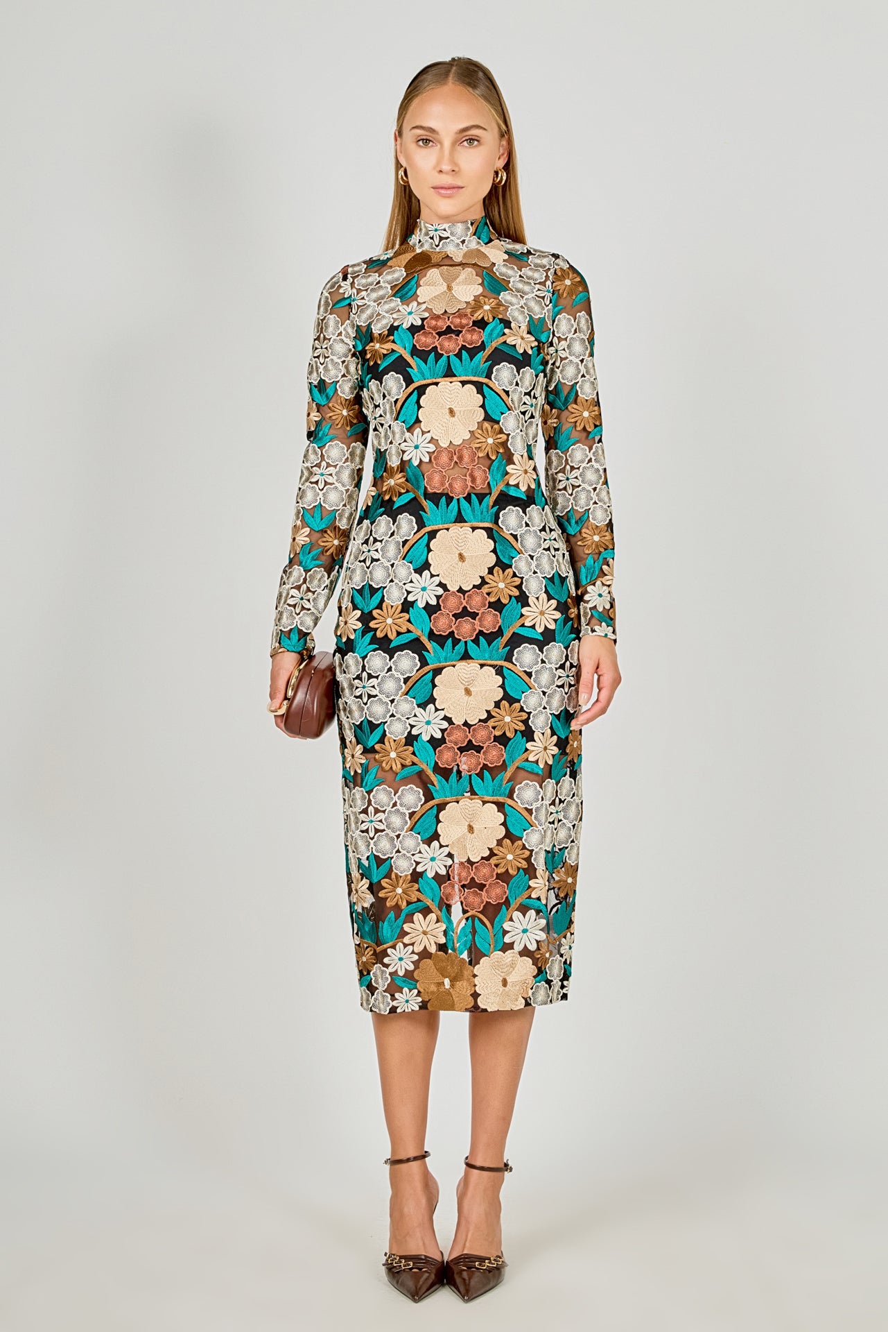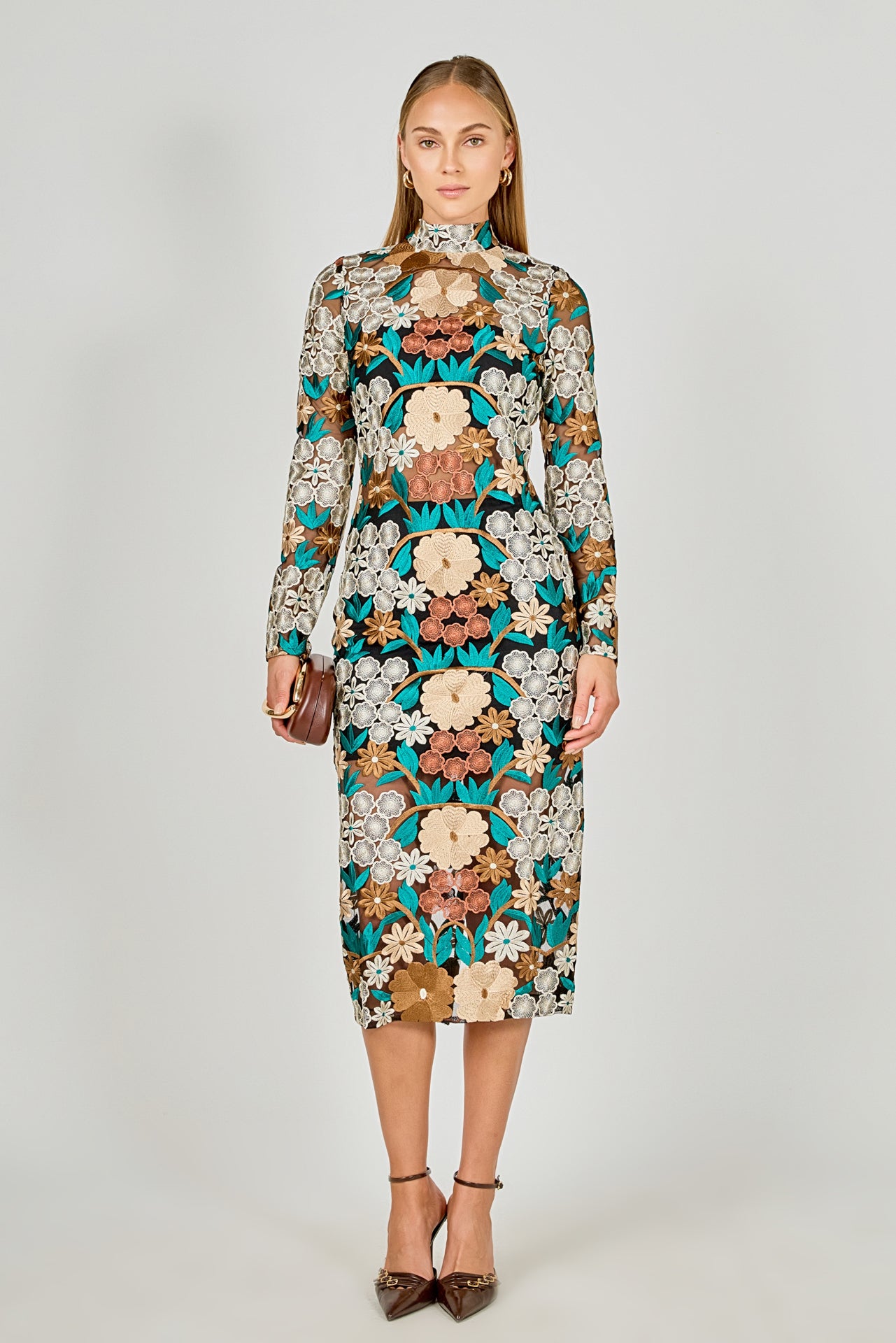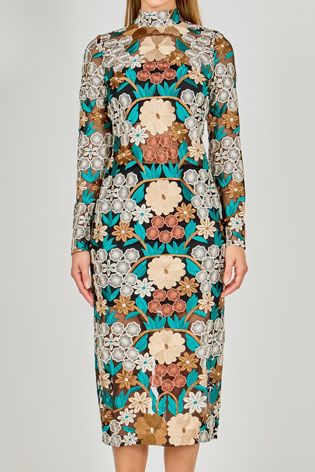 This beautiful Floral Embroidered Midi Dress will complete any look. With a fitted silhouette and midi length it features a mockneck and eye-catching embroidery. Perfect for special occasions this elegant dress is sure to be a wardrobe favorite. Get this stunning dress today to express your own unique style.