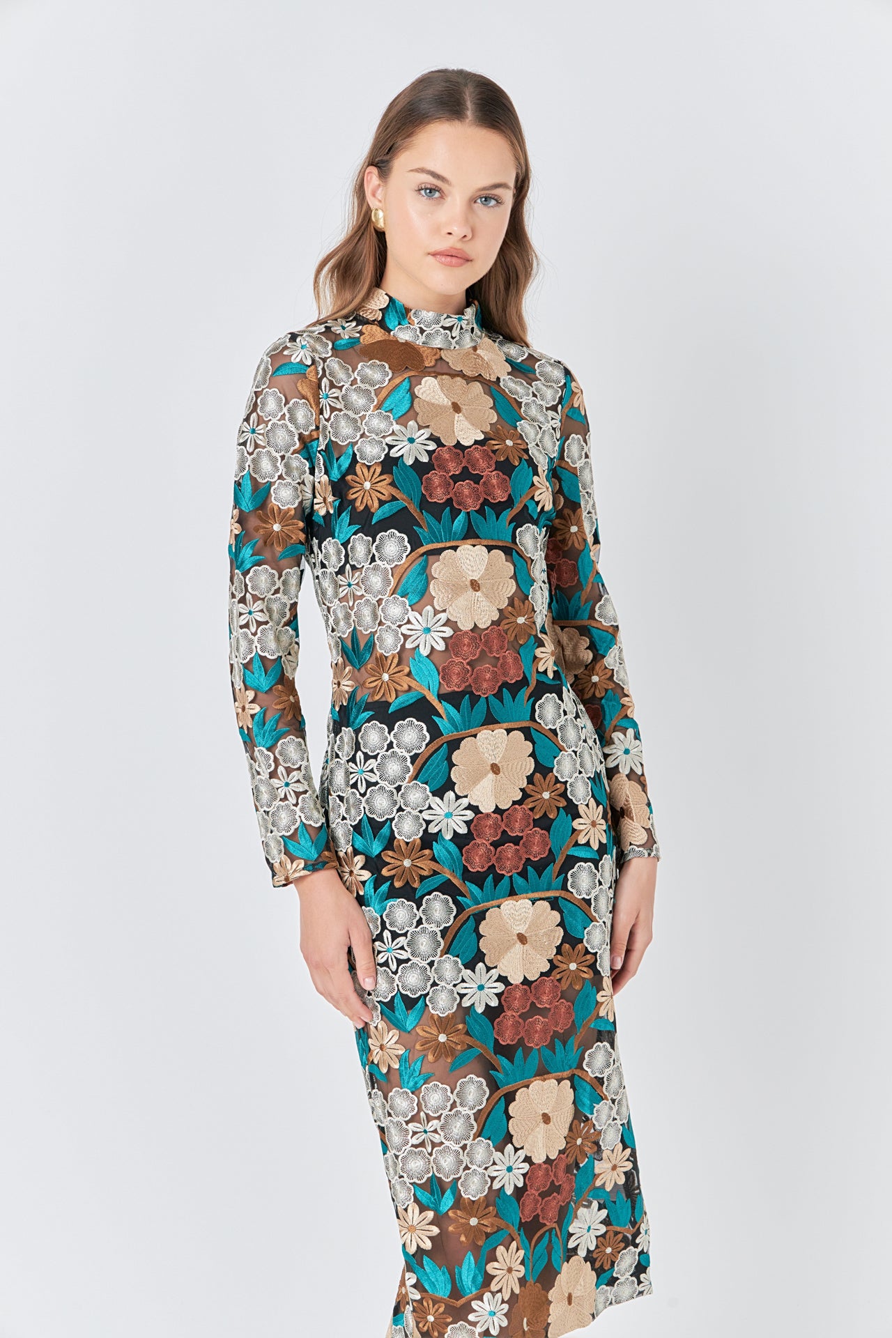 This beautiful Floral Embroidered Midi Dress will complete any look. With a fitted silhouette and midi length it features a mockneck and eye-catching embroidery. Perfect for special occasions this elegant dress is sure to be a wardrobe favorite. Get this stunning dress today to express your own unique style.