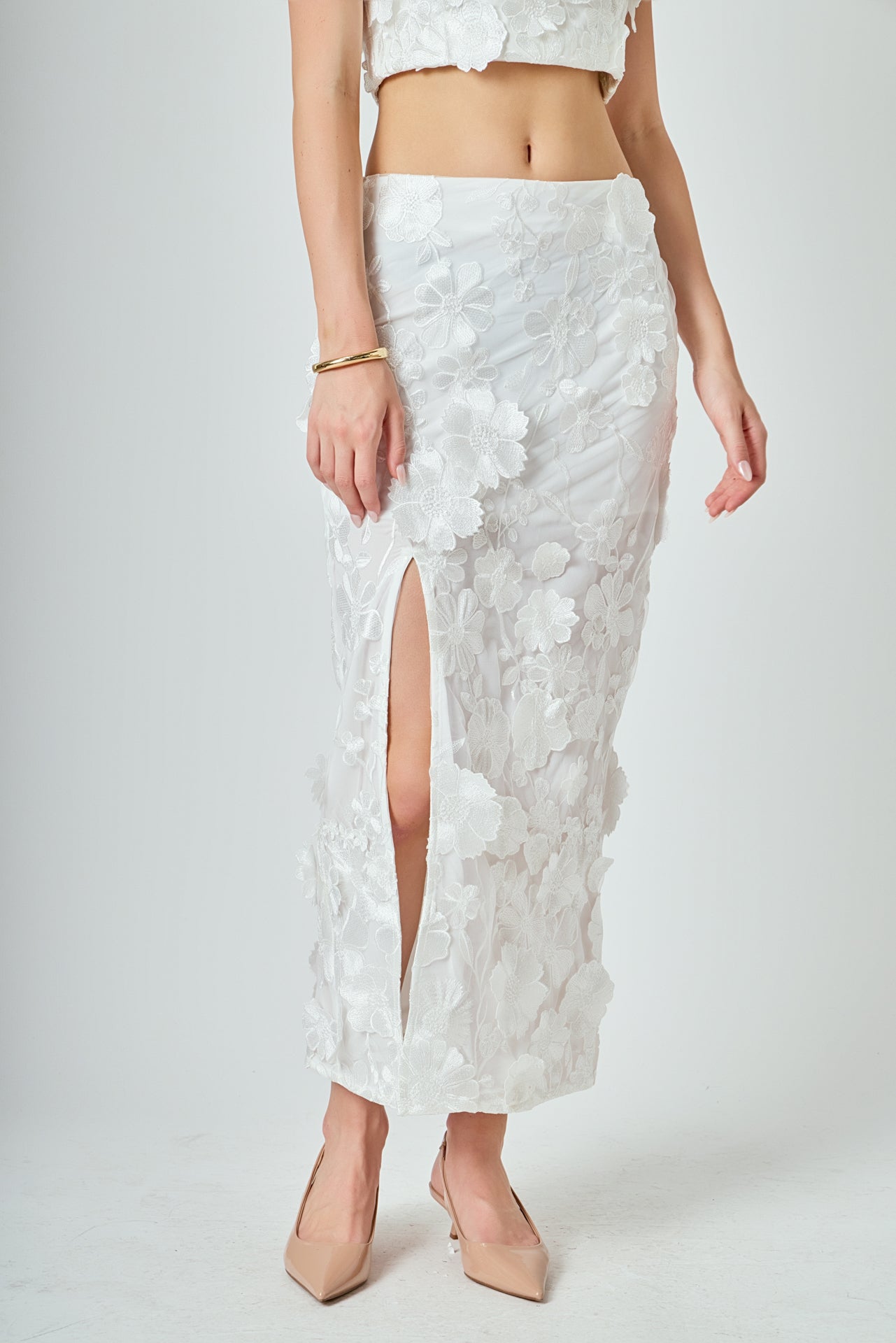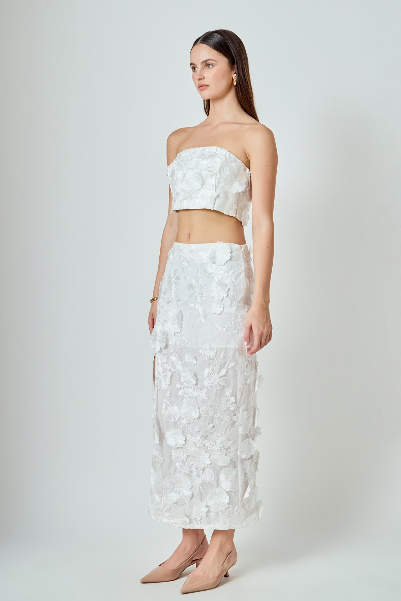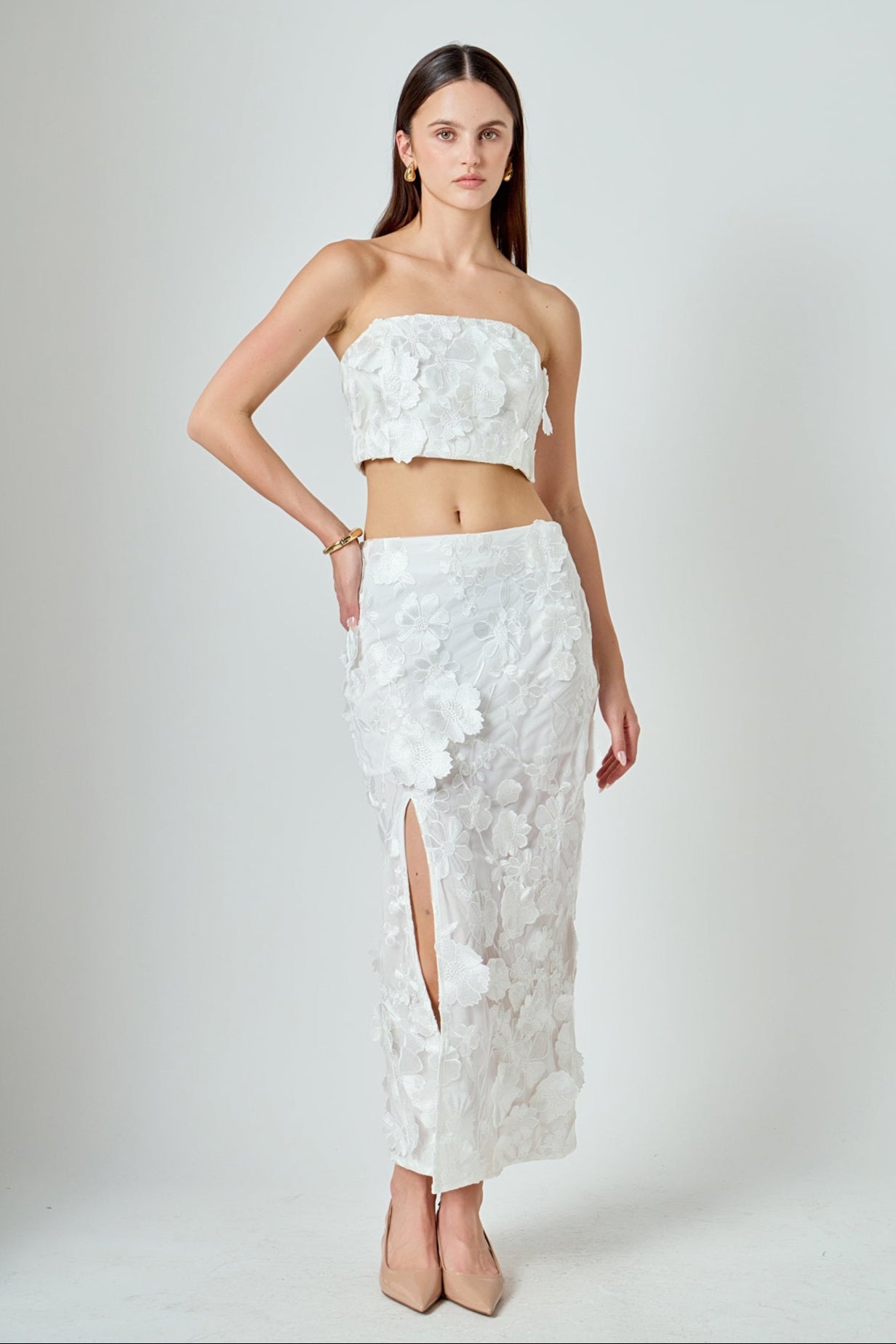 Elevate your summer style with this stunning Floral Embroidered Set. The set includes a strapless top and a flowy maxi skirt with a stylish side slit. The intricate embroidered details add a touch of elegance to this outfit. Perfect for any occasion, this set can be dressed up with heels or dressed down with sandals. Stand out from the crowd and turn heads with this must-have set. Add this floral set to your collection today and bloom in style. Make a statement with our Floral Embroidered Set.
