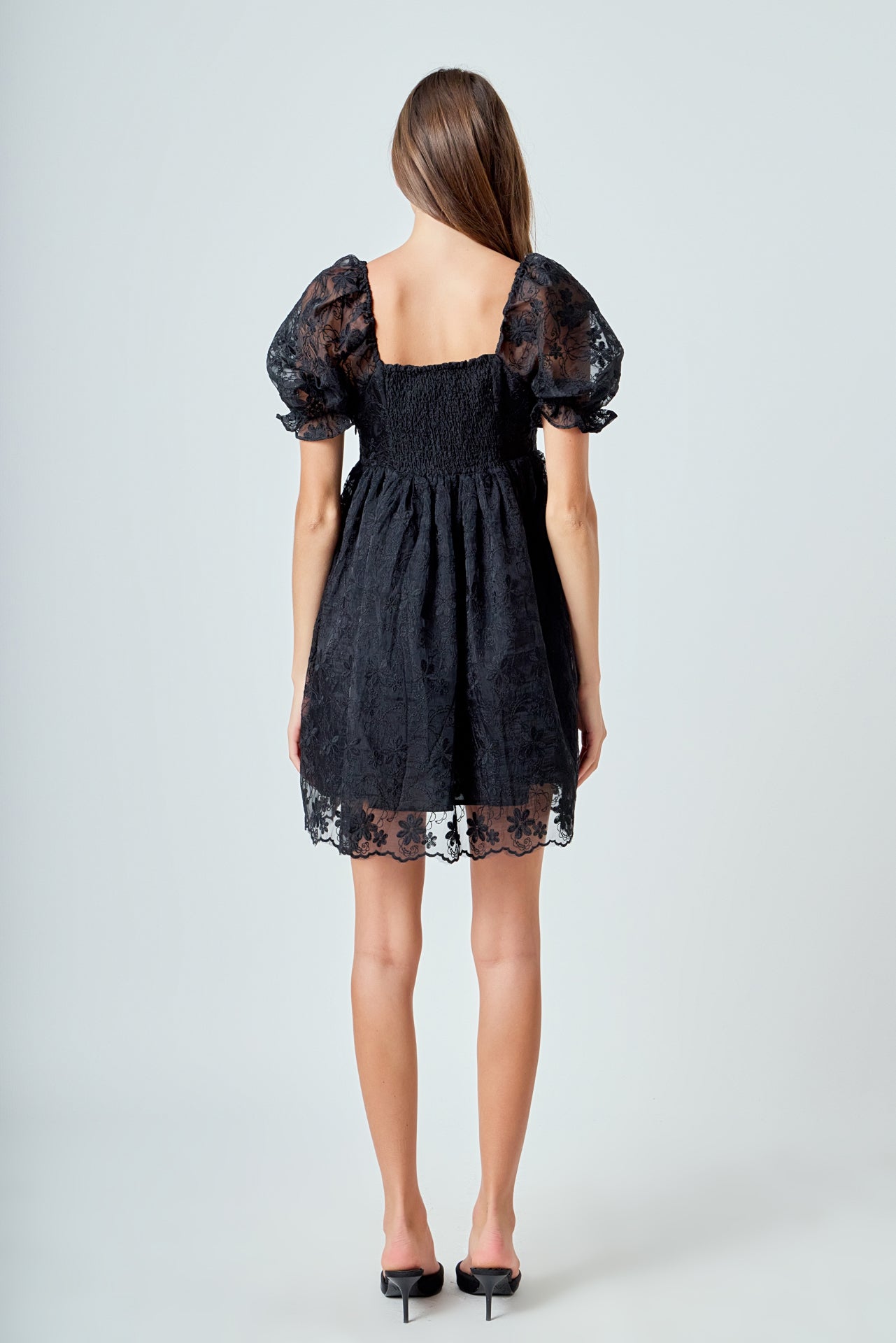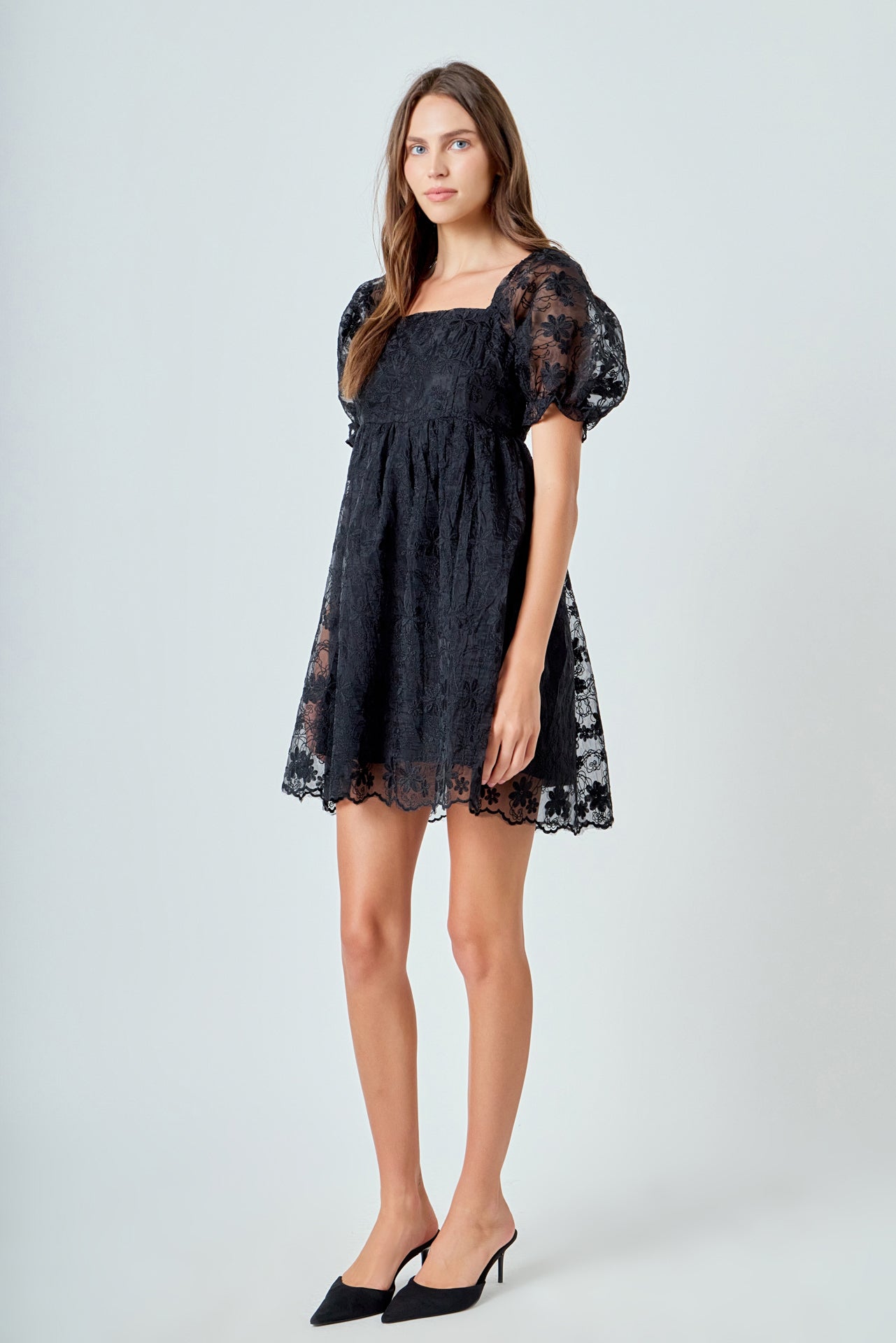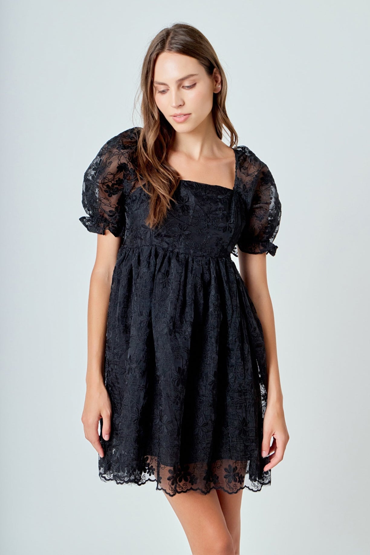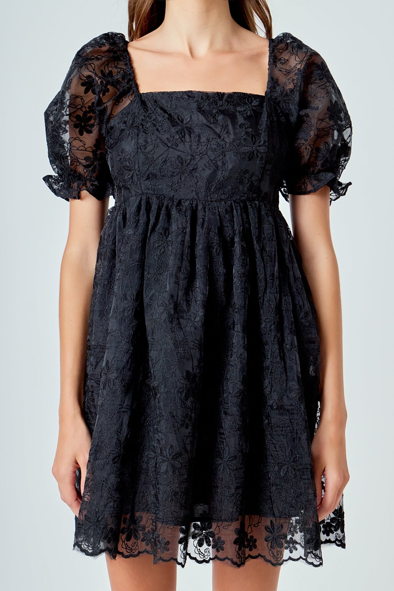 This floral embroidered babydoll dress is perfect for a day out or a special event. With a stylish square neckline and puff short sleeves, this dress is sure to turn heads. And with its back zipper closure and scalloped hem, you'll feel confident and beautiful all night long.