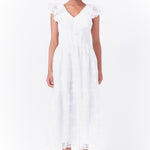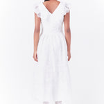 Add a touch of elegance to your daily routine with this flirty midi dress. A perfect feminine silhouette with delicate floral embroidery, this dress is sure to turn heads. The ruffle shoulder detail adds a touch of whimsy while the side pockets make it practical for everyday wear. Dress it up or down, this versatile piece will take you from work to play with ease.
