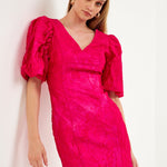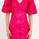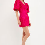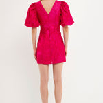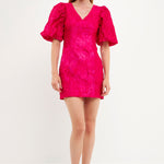 This mini dress is perfect for a special occasion. The floral sheen jacquard fabric is beautiful and the puff sleeves add a touch of femininity. The V neckline is flattering and the back zipper makes it easy to put on. The lining ensures that the dress is not see-through and the mini length is perfect for showing off your legs. The fitted silhouette is very flattering and makes this dress a great choice for any woman.