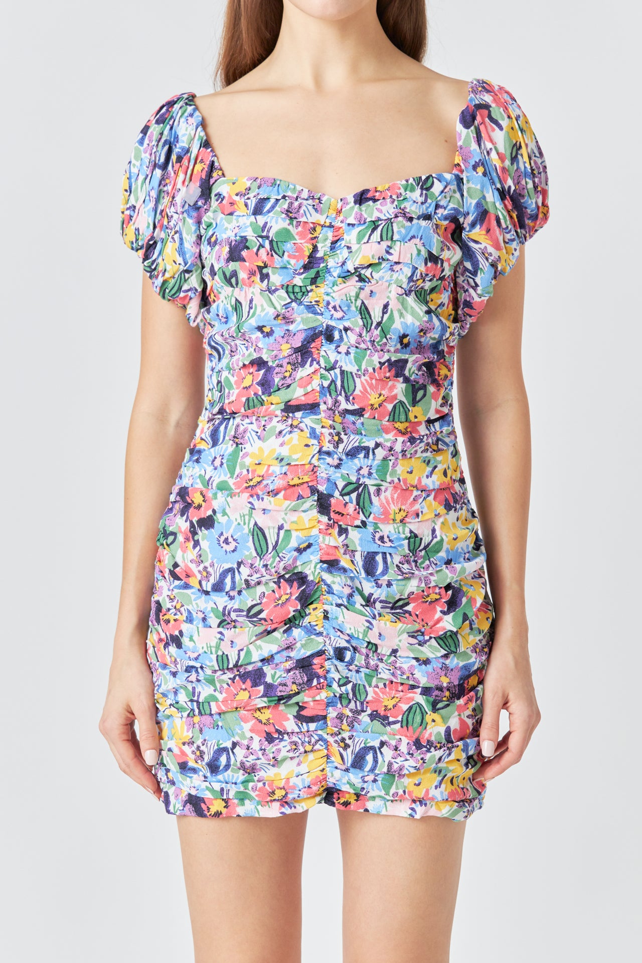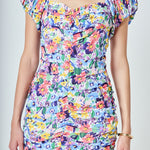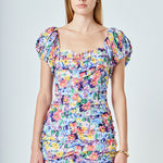 Turn heads in this flirty mini dress. With a pleated bust and ruched bodice, this dress is a show-stopper. The short puff sleeves are functional off the shoulder for a cool and relaxed look. The lining ensures you'll feel comfortable all night long. This figure-hugging mini is perfect for any formal occasion, from weddings to galas.