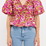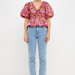 The perfect top for your next special event. With its beautiful floral print and flattering pleated skirt, this top is sure to turn heads. The back zipper closure keeps you looking polished all night long, while the puff sleeves add a touch of glamor. Pair it with a sleek skirt or trousers for a look that's equal parts elegant and effortless.