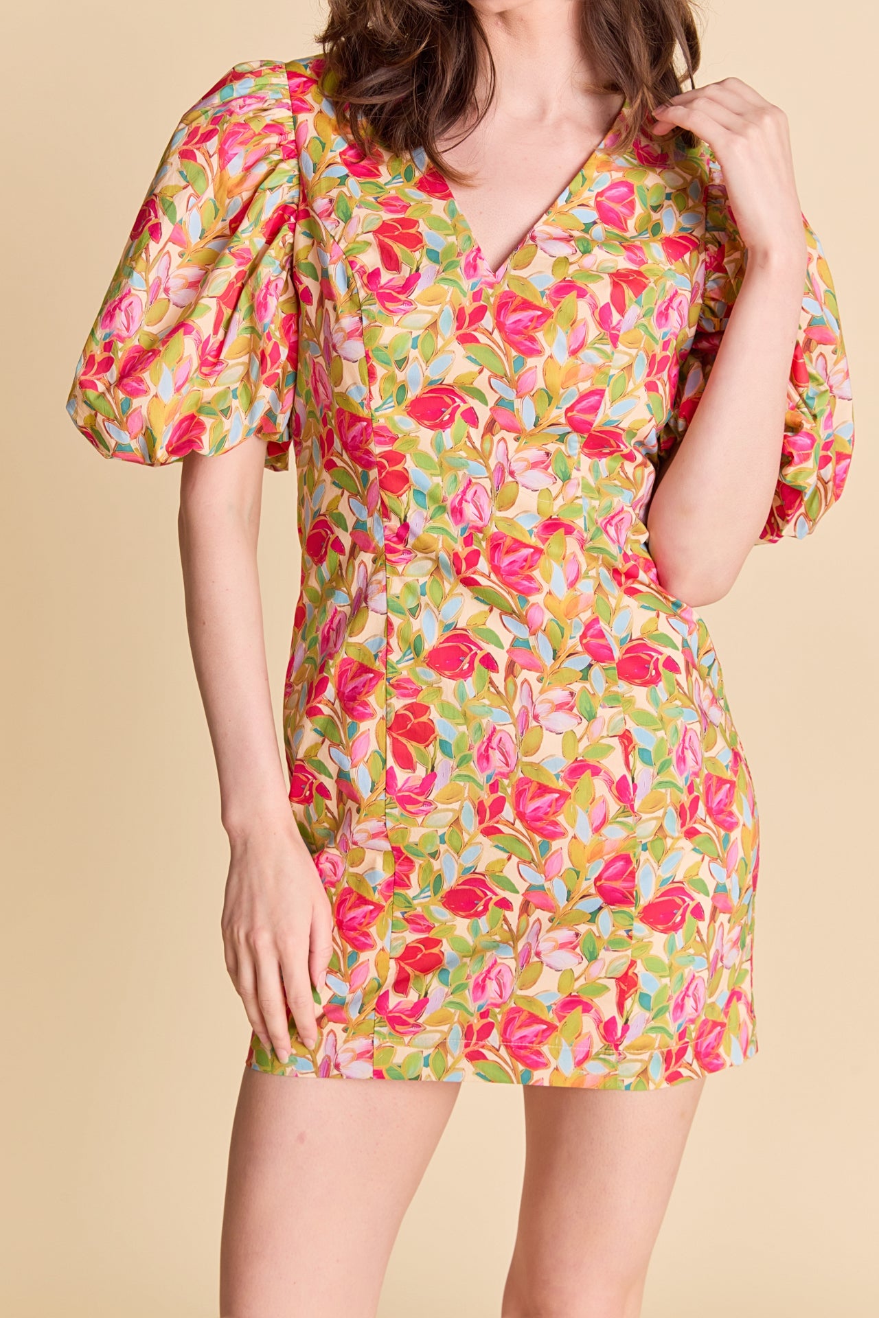 Bring vibrant energy to your wardrobe with our Floral Print Mini Dress. The flattering V-neckline and voluminous puff sleeves create a playful silhouette, while the fitted waist and mini length highlight your natural curves with ease. Crafted in a bold floral pattern, this dress effortlessly adds feminine charm to your look. Ideal for everything from garden parties to city strolls, it's a standout piece that brightens any occasion.