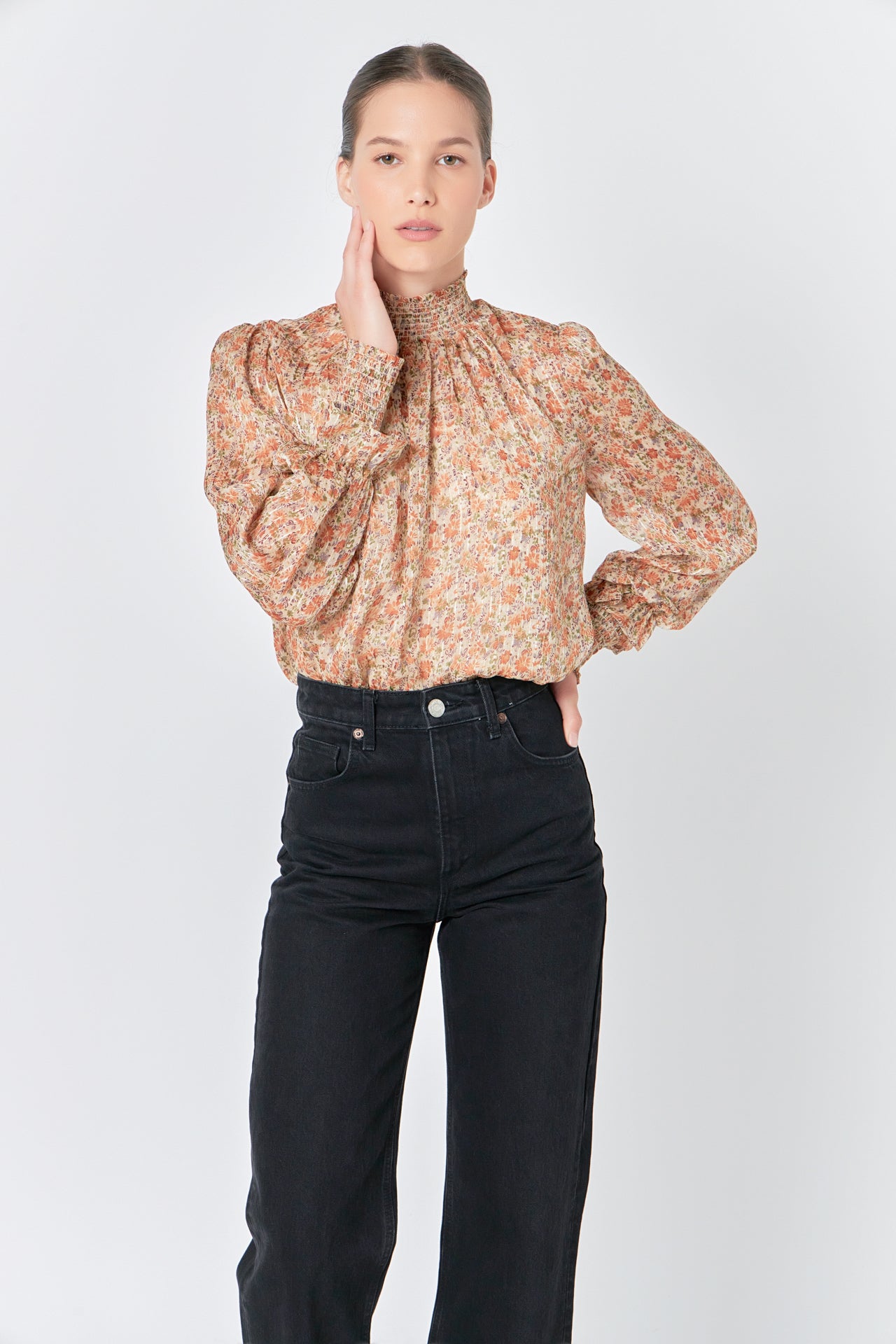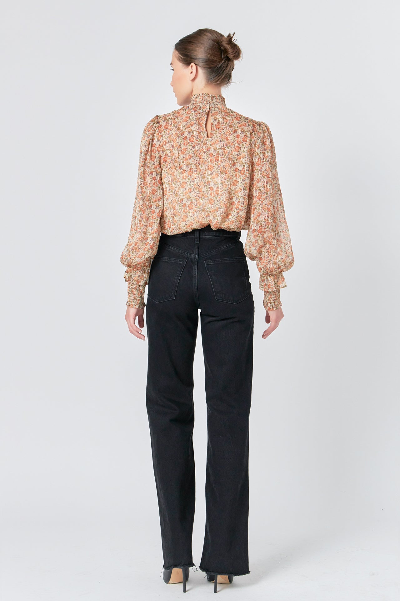 - Long sleeves with smocked cuffs