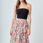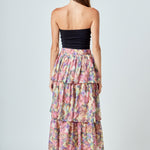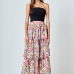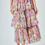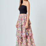Make a statement with our elegant Floral Tiered Maxi Skirt. This versatile skirt features a beautiful floral design that will add a touch of femininity to any outfit. With its flowy maxi length, it's perfect for any occasion. The tiered skirt adds a playful touch while the elastic band at the waist ensures a comfortable and flattering fit. Whether dressed up with heels or kept casual with sandals, this skirt will be a staple in your wardrobe. Don't miss out on this must-have piece!