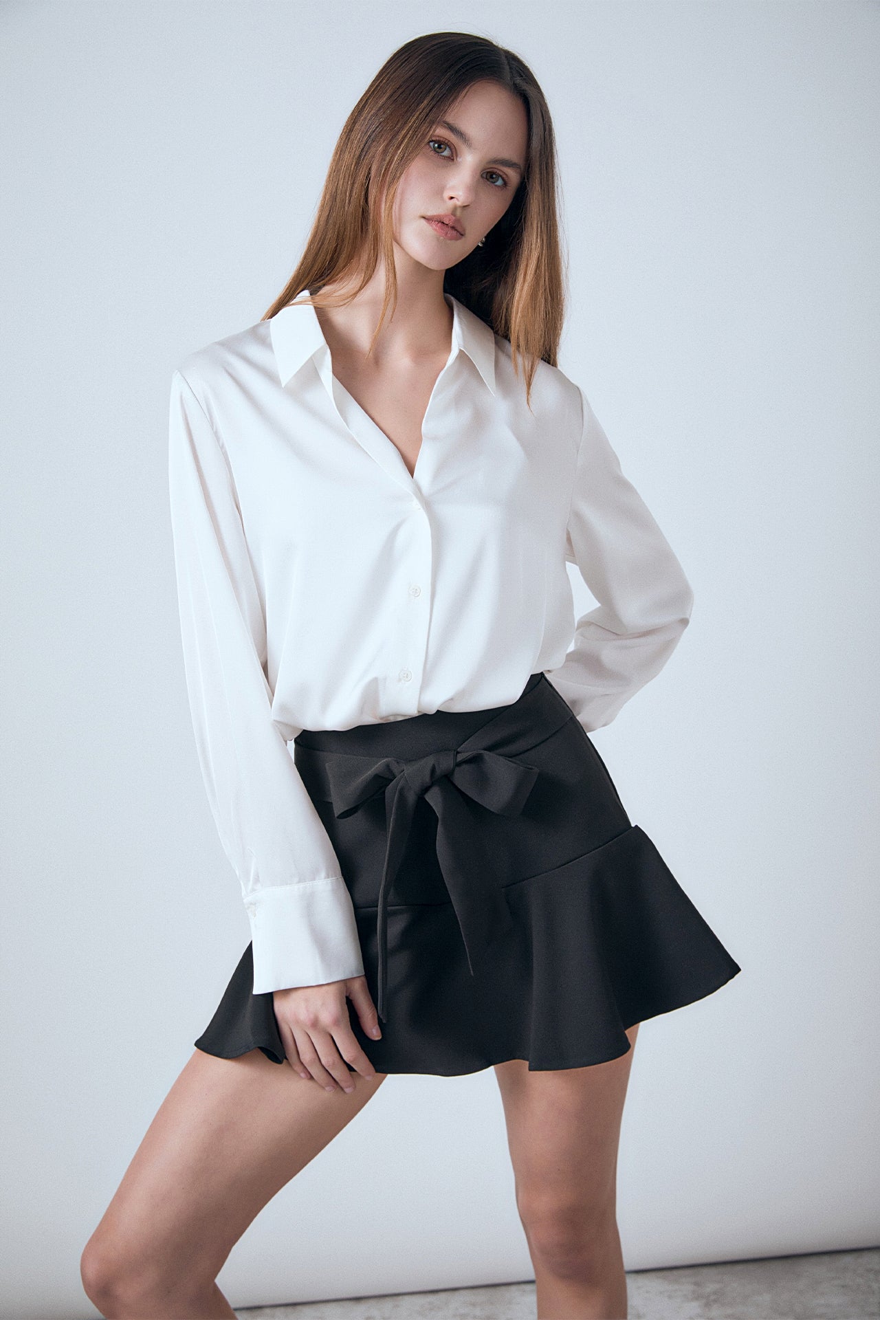 This flowy mini skort is perfect for dressing up or dressing down. With a waist tie detail and side zipper, this skort is a fashion-forward piece you'll love. Its high waisted fit makes it super flattering and comfortable to wear. Dress it up with heels and a blazer for a night out, or dress it down with sandals and a tank top for a more casual look.