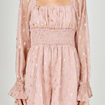 This Foiled Dot Long Sleeves Romper is an elegant, sophisticated choice for any special occasion. It features an all-over foiled dots print, an elastic waist, smocking detail on the sleeve hem, and a romper design for a unique, fashionable look.