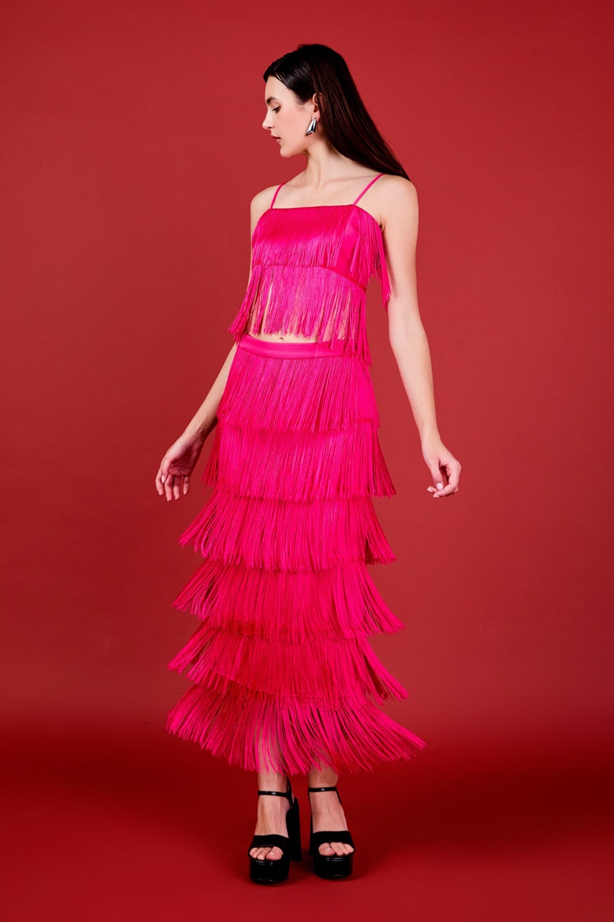 Introducing our Fringe Tiered Maxi Skirt, perfect for the free-spirited fashionista. This skirt exudes bohemian vibes with its fringed details and flowy maxi length, making it a must-have for any music festival or summer getaway. The tiered design adds dimension and movement, while the waist band provides a comfortable and flattering fit. Dress it up with heels for a night out or pair with sandals for a beachy look. Embrace your inner wild child with our Fringe Tiered Maxi Skirt. Shop now and elevate your wardrobe with this unique statement piece.