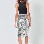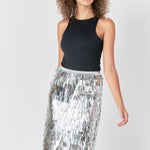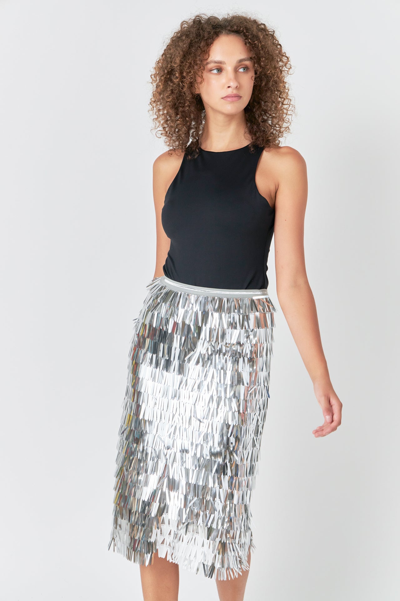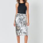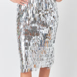 Make a bold statement with this standout Fringed Metallic Midi Skirt! This stunning piece features sparkling fringe sequins in a high-shine metallic finish. The midi length and mid-stretch fabric creates a comfortable flattering fit that's perfect for any special occasion. Embody confidence and style with this eye-catching skirt and shine your brightest!