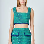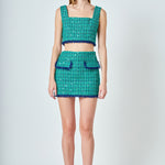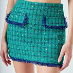 This high-waisted mini skirt is made with vibrant sequin tweed and features contrasting fringe trim. Secured with a side zipper.
