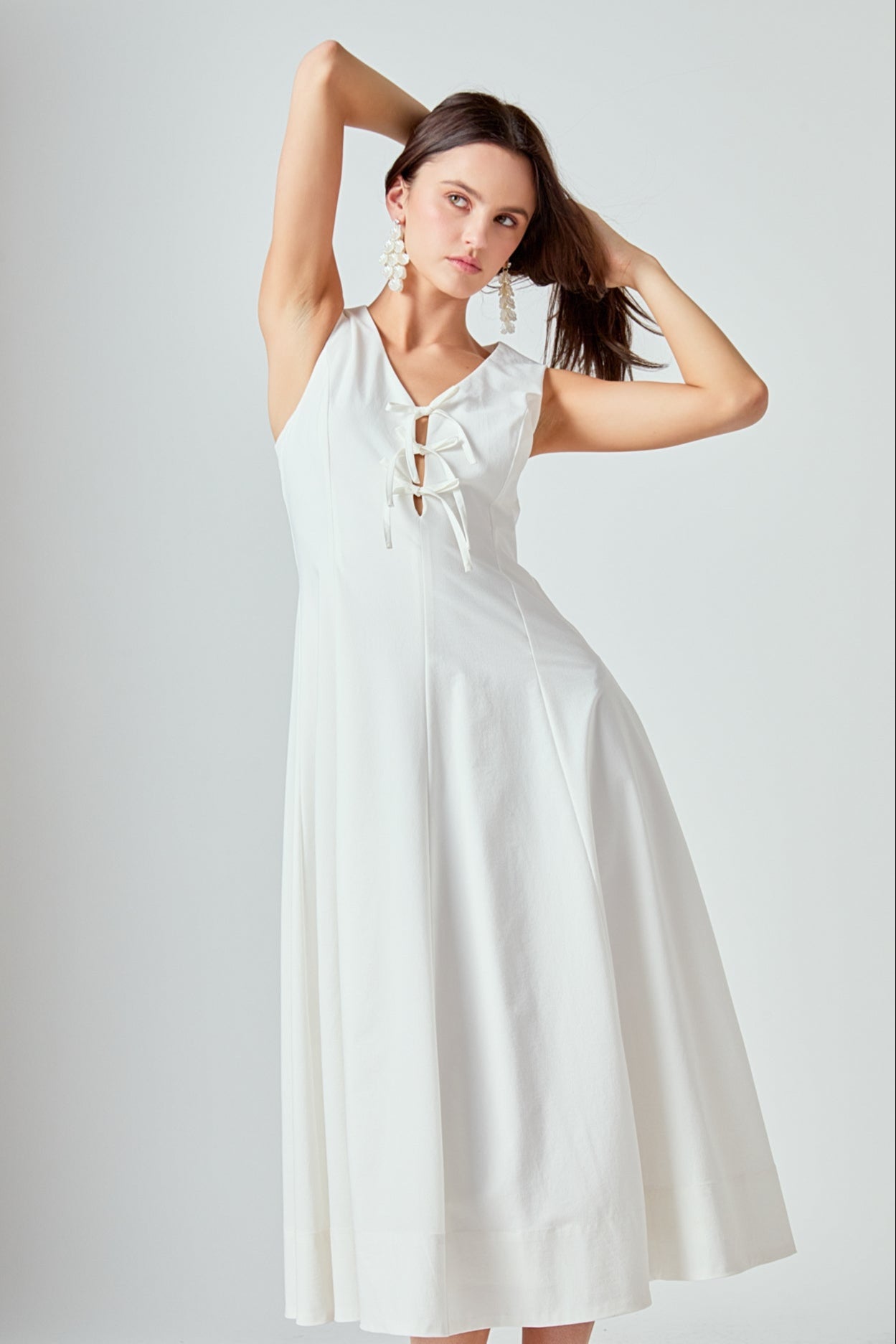 Looking for a sophisticated and stylish dress? Look no further than our Front Bow Tie Midi Dress. With a solid, stretchy fabric and a flattering fit, this dress hugs your curves in all the right places. The front bow tie adds a feminine touch, while the sleeveless design keeps you cool and comfortable. Perfect for any occasion, this dress will make you stand out in any crowd. Upgrade your wardrobe with this must-have dress that combines fashion and comfort seamlessly. Order yours today and make a statement!