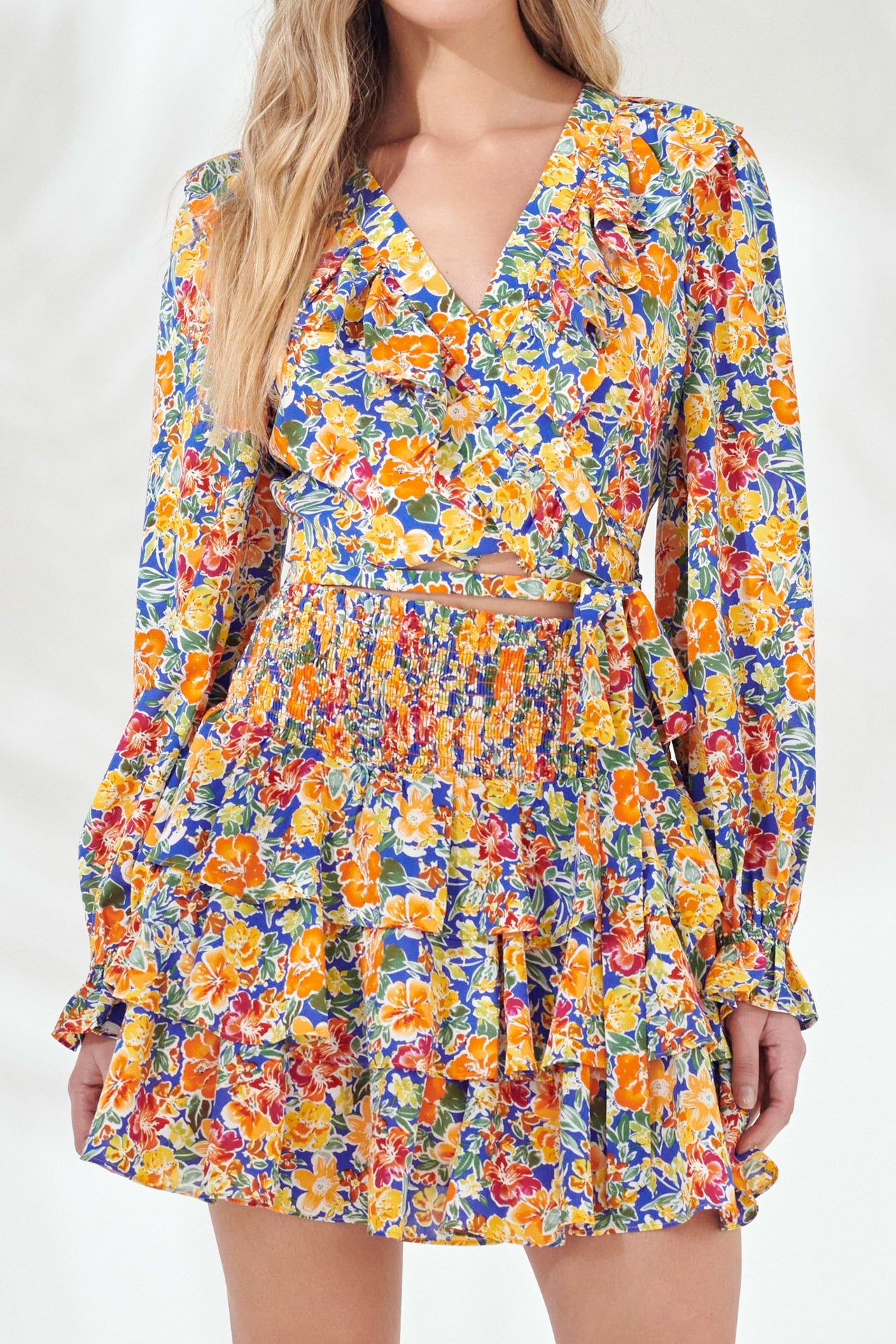 This wrap top is so flattering you'll want to wear it everywhere. The front wrap style is accented with a ruffled neckline long sleeves and a cropped length. The floral print is perfect for adding a pop of color to any outfit.