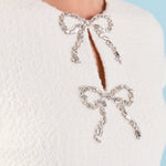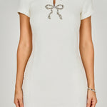 Looking for a dress that will make you stand out? Look no further than our Bow Embellished Mini Dress! This stunning dress features a round neckline and mini length for a flattering silhouette. The back invisible zipper closure ensures a seamless fit, while the rhinestone bow point adds a touch of glamour. Perfect for a night out or a special occasion, this dress is a must-have for any fashion-forward woman. Don't miss out on the chance to elevate your wardrobe with this show-stopping dress.