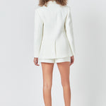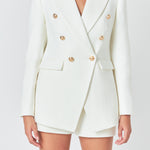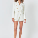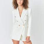 Elevate your wardrobe with our Gold Buttoned Tweed Blazer - the perfect blend of classic and trendy. The front buttons and structured collar add sophistication while the front flap pockets offer functionality. Our blazer is crafted from high-quality tweed for a luxurious touch. The long sleeves ensure versatility making it suitable for any season. Whether you're dressing up for a special occasion or dressing down for a casual day out this blazer will make a statement. Upgrade your style game with this must-have piece. Accessorize with a statement necklace for a chic look. Perfect for work or play. Shop now!