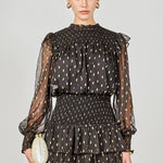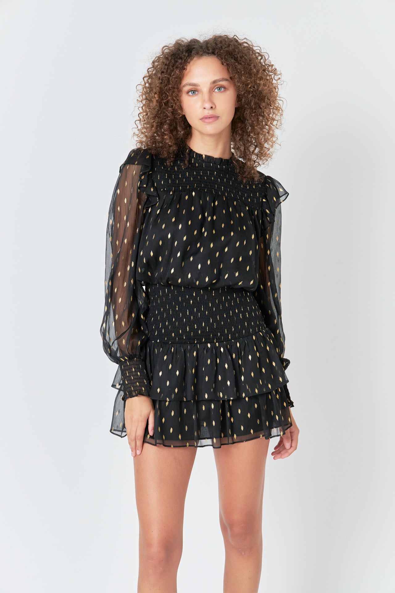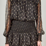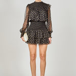Get ready to turn heads with our Gold Dot Printed Mini Dress. This playful dress is designed with a charming dot print that's sure to catch everyone's attention. The smocking at the yoke accentuates your curves while the ruffles at the neckline and long sleeves with smocked cuffs add a touch of feminine flair. Perfect for date night a night out with the girls or any special occasion. You'll feel confident and beautiful in this dress. So what are you waiting for? Add this dress to your wardrobe and get ready to shine!