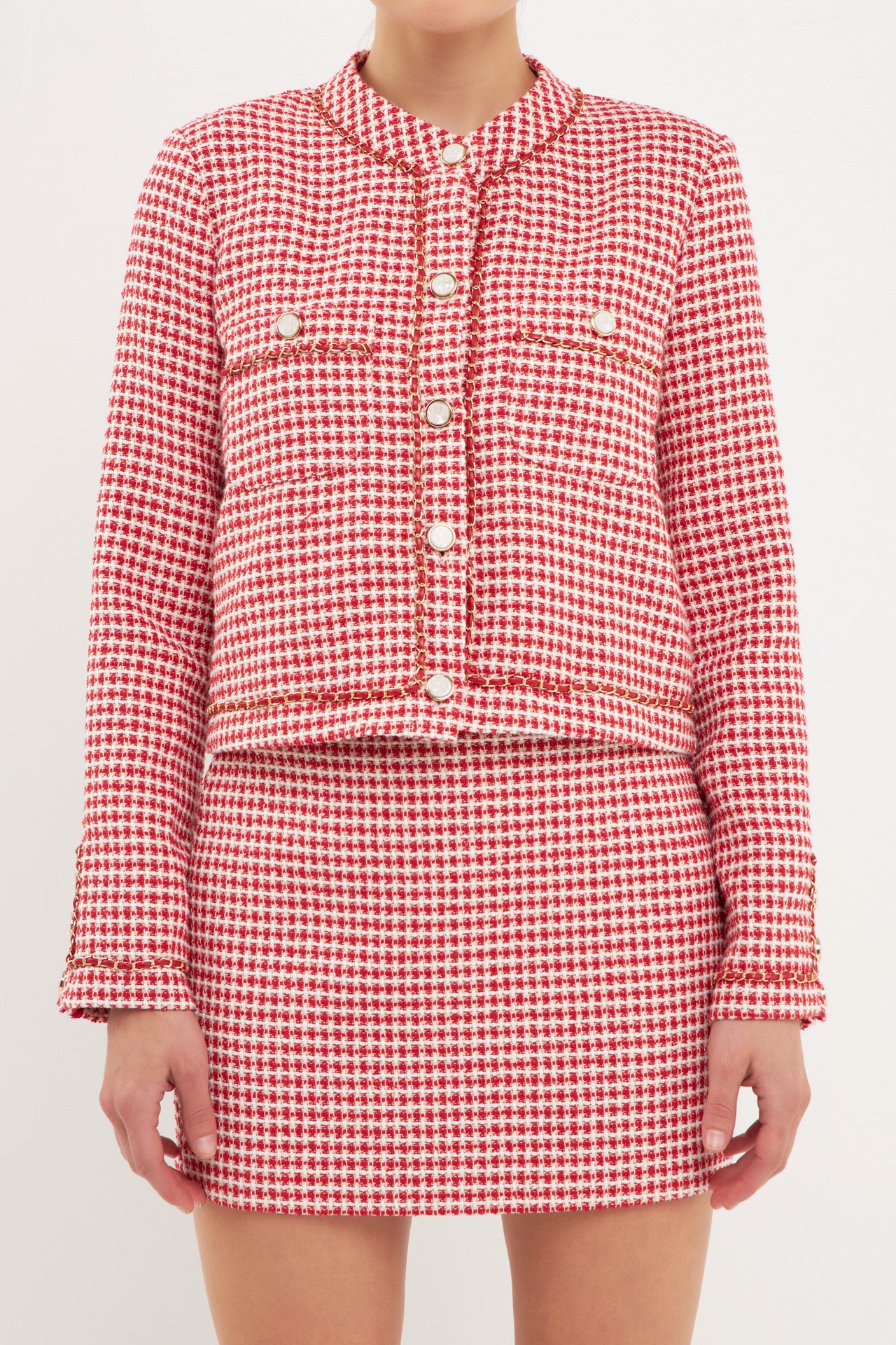 This Gold Tweed Speckled Mini Tweed Check Blazer is perfect for any occasion and will help you stand out in the crowd. Featuring tweed fabric, chain trim detail, two front pockets, and long sleeves, you'll look sophisticated and stylish. Show off your edgy fashion sense and turn heads wearing this unique blazer. The luxurious texture and detail of this blazer will make a fashion statement, so make sure to snag this before it goes out of stock.