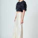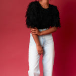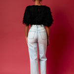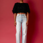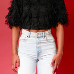 Get the perfect blend of edgy and boho with this cropped length top from Endless rose. The black gridded mesh is layered over dotted feathers and features a round neckline plus a back neck button closure and lining keep it comfortable and light. Style with jeans and sneakers for an effortlessly cool look that is perfect for day or night.