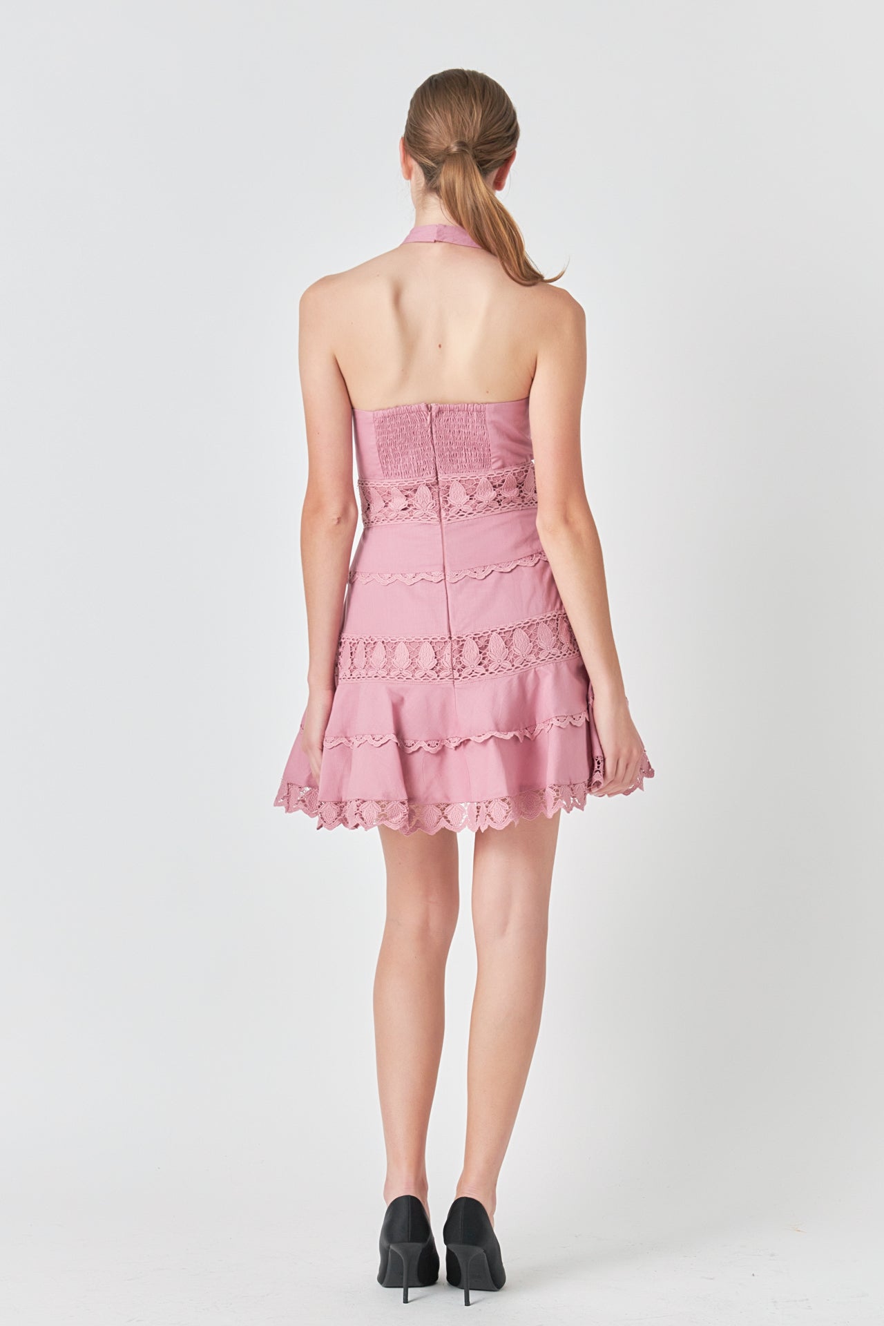 This halter neck lace trim dress is perfect! The crossed halter neck flatters your shoulders and neck, while the lace trimmed skirt adds a touch of elegance. The center back invisible zipper closure ensures a perfect fit, and the smocking detail at the back bodice adds a bit of flair.