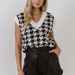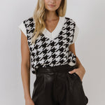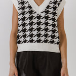 A little bit of hounds tooth goes a long way. This chunky sweater vest is the perfect layering piece for cold winter days. Boyfriend fit make it comfortable and layer friendly. With its classic Hounds tooth print, this vest will add a touch of sophistication to any outfit.