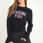 Wrap yourself in cozy comfort and a playful message with our J'adore You Sweater. Made with a soft and quality knit, this sweater features a charming "J'adore" motif for a touch of French flair. The round neckline and long sleeves provide a classic and versatile look. Perfect for any occasion, this sweater will keep you stylish and warm all season long. Don't miss out on this must-have addition to your winter wardrobe. Get your J'adore You Sweater now and spread the love!