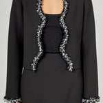 Elevate your look with the Jewel Scalloped Jacket. Featuring a stunning scalloped, jewel-embellished opening, this open-front jacket adds instant elegance to any outfit. With long sleeves, full lining, and a chic tailored fit, it’s perfect for parties, weddings, or any special occasion. Add it to your wardrobe and shine all night.