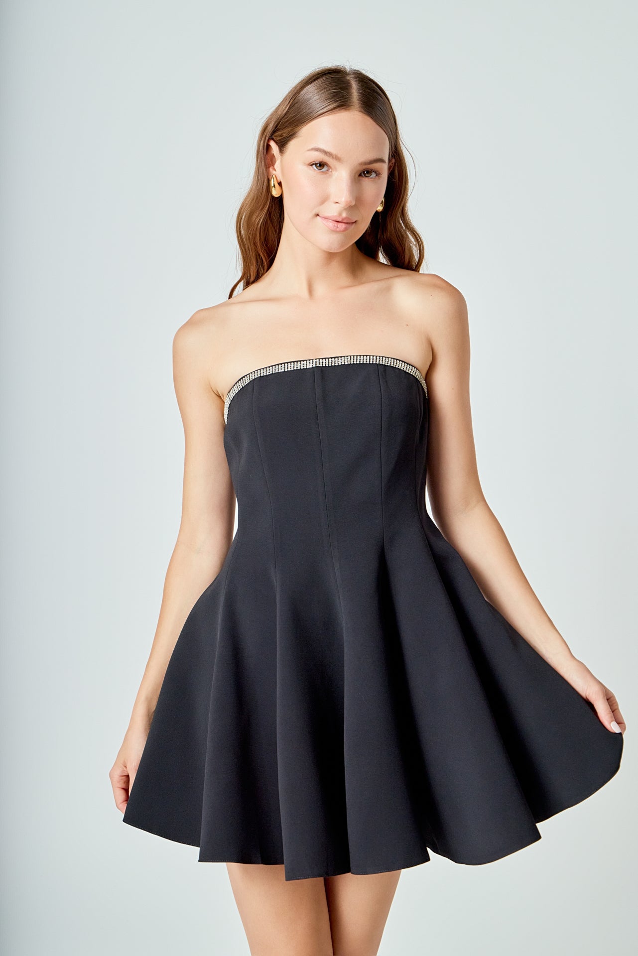 Make a statement in our Jewel Trim Flounced Mini Dress. Adorned with sparkling jewel trim, this dress is perfect for any special occasion. With a flattering strapless neckline and a flounced skirt, you'll feel confident and stylish all night long. The mini length adds a flirty touch, while the jewel trim adds a touch of glamour. This dress is the perfect blend of elegance and fun. Pair it with your favorite heels and statement jewelry for a head-turning look. A must-have for any fashion-forward wardrobe. Shop now and be the belle of the ball!