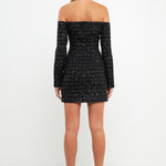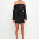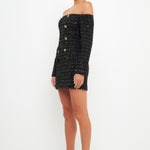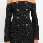 Constructed with mediumweight sequin tweed, this mini dress combines modern and classic elements. The double-breasted style buttons and pocket flaps are reminiscent of a traditional tweed blazer, while the off-shoulder neckline is a newer silhouette.