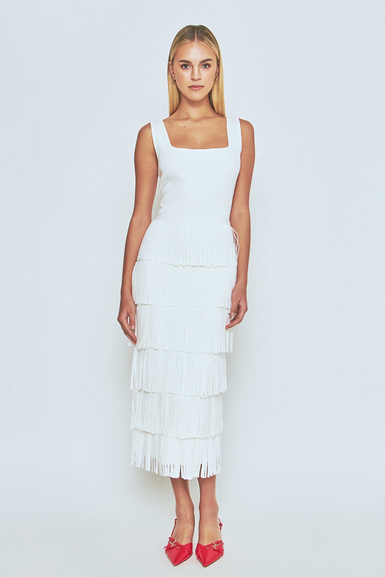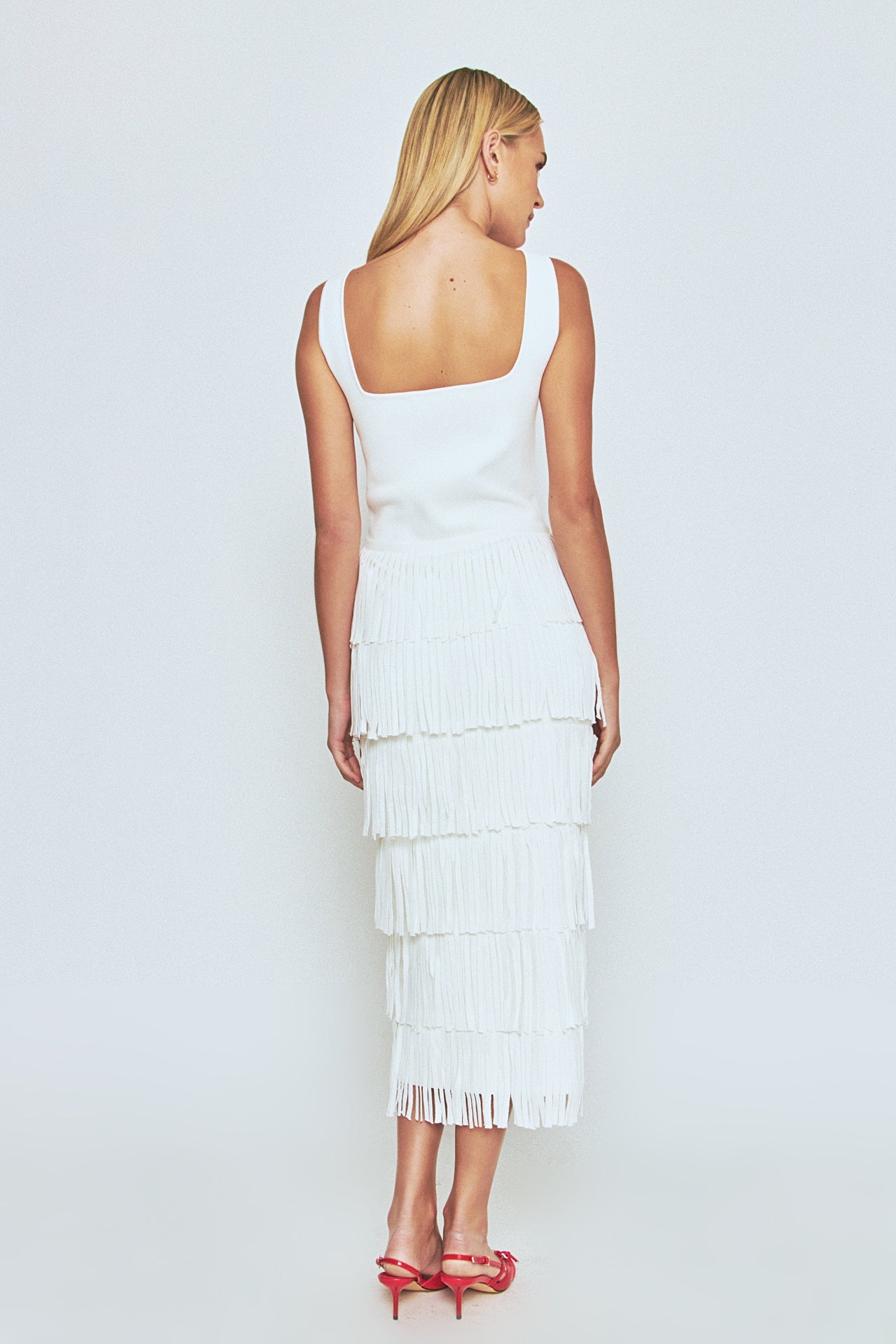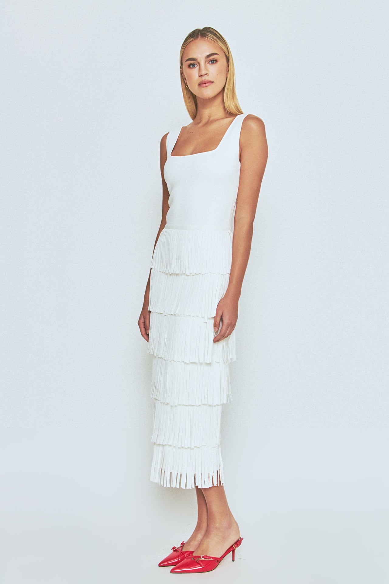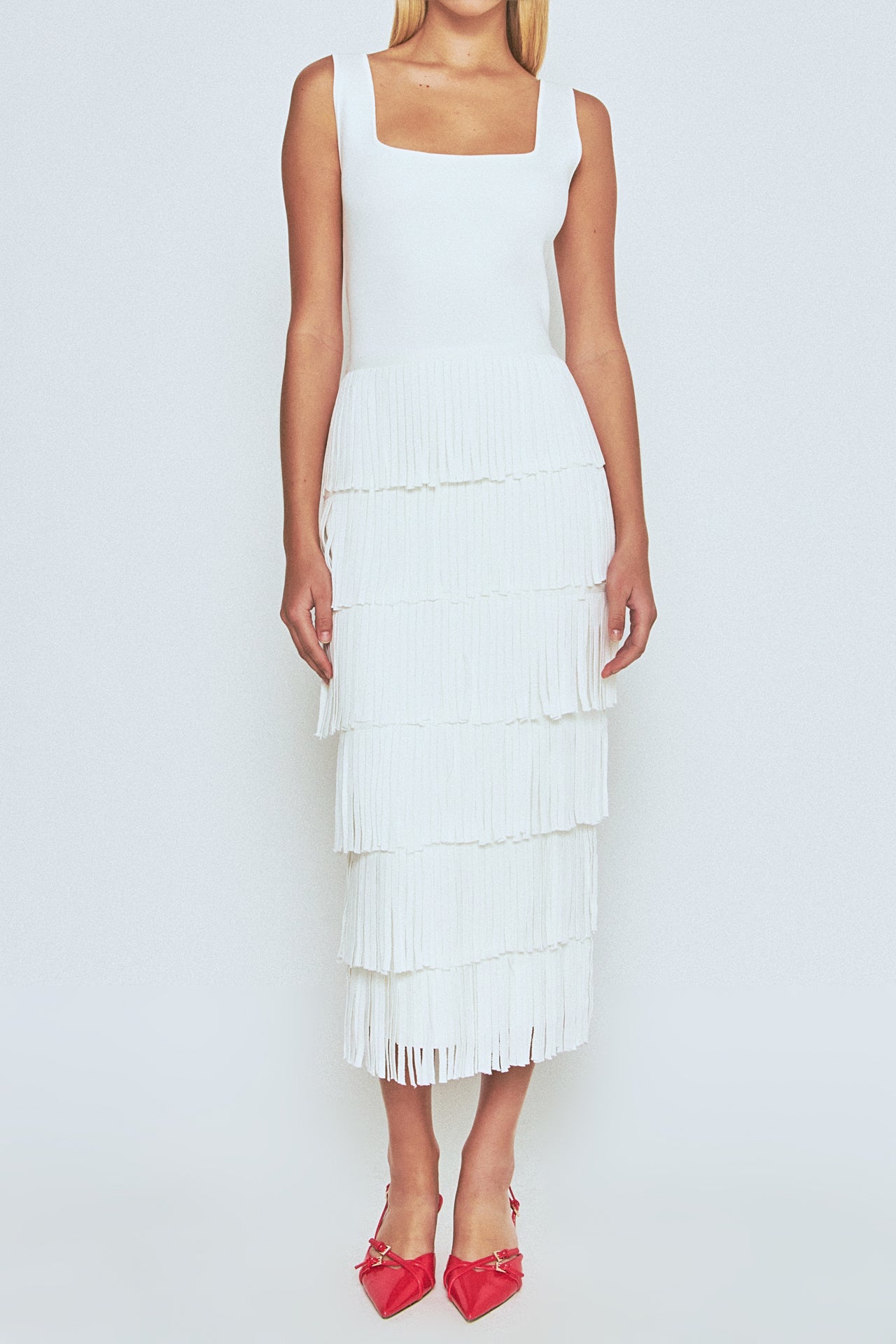 This beautiful Knit Fringe Long Dress is perfect for a special occasion. In a figure-flattering knit fabric, it features a Square neckline, a Tiered fringe skirt, and a concealed side zipper. This girlie dress stands out with its unique look, so you will be sure to get noticed. The added fringe is the perfect detail to make the dress extra special. Shop now, and you'll be ready for any event.