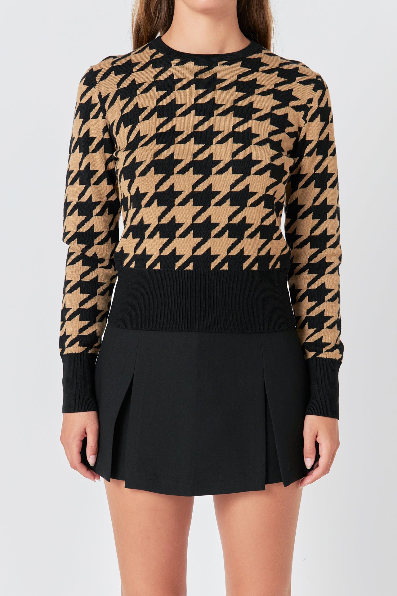 This Knit Houndstooth Sweater is the perfect addition to your wardrobe! The top is crafted from knit fabric with a fitted silhouette and round neckline. The eye-catching houndstooth pattern adds a fashionable touch that will easily elevate any outfit. The flattering fit and unique print make this sweater a must-have item. Style yours with jeans or skirts for a stylish look that's sure to turn heads.