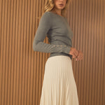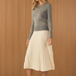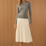 Introducing our must-have Knit Midi Skirt that will elevate your wardrobe. With its perfect midi length, you'll stay on-trend and comfortable all day long. The soft knit fabric hugs your curves in all the right places, while the pleated design adds a touch of sophistication. Featuring a back zipper for easy wear, this skirt is perfect for any occasion. Its versatile style and exceptional quality make it a wardrobe staple. Shop now and effortlessly elevate your look with this chic Knit Midi Skirt.