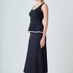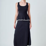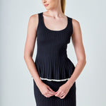 Introducing our Knit Pleated Tipped Sleeveless Top, perfect for adding a touch of elegance and modern style to your wardrobe. Crafted from high-quality knit material, this top offers comfort and durability. The contrast tipped design adds a pop of color and contrast to elevate your look. The pleated detailing on the front adds texture and dimension, making you stand out from the crowd. Complete with a round neckline, this top is versatile and can be dressed up or down for any occasion. Upgrade your style game with this must-have top.