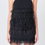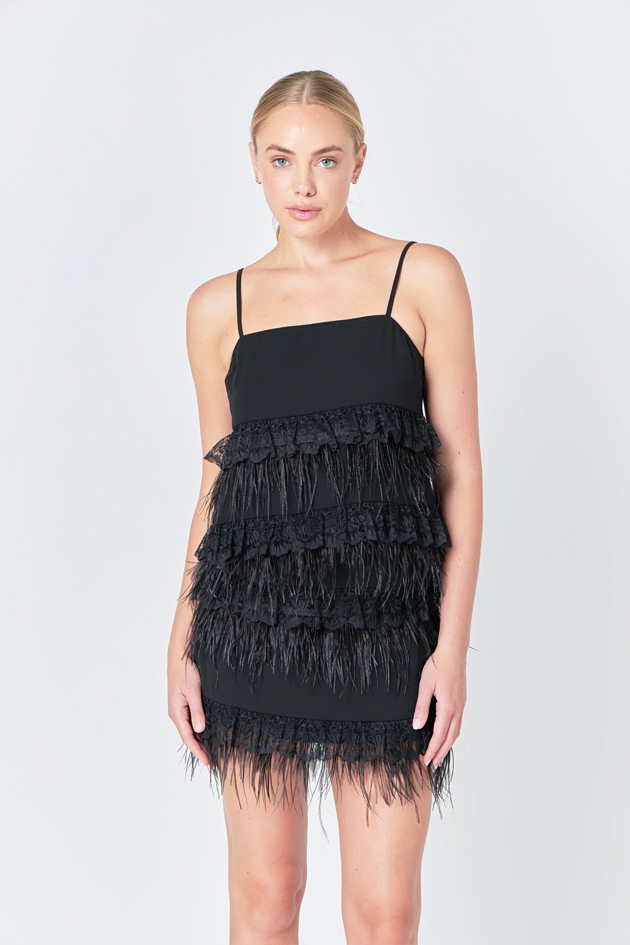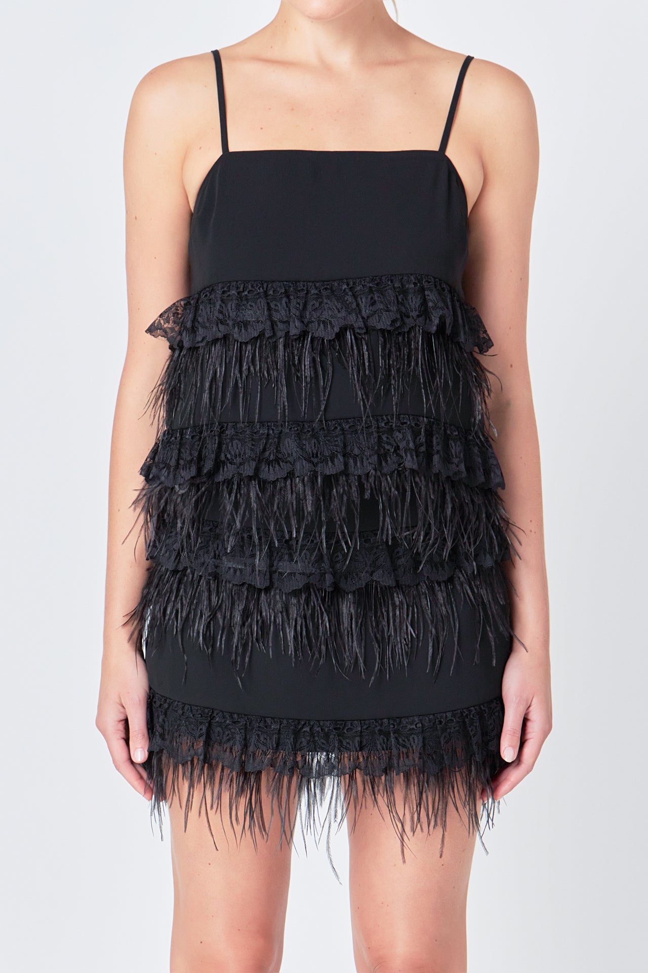 Highlight your glamorous style with this Lace & Feather Tank Top! Featuring a sleeveless silhouette spaghetti straps and lace and feather tiered detailing this top is sure to make a statement. A lined inside makes this top comfortable and stylish. Show off your unique style in this eye-catching tank top today!