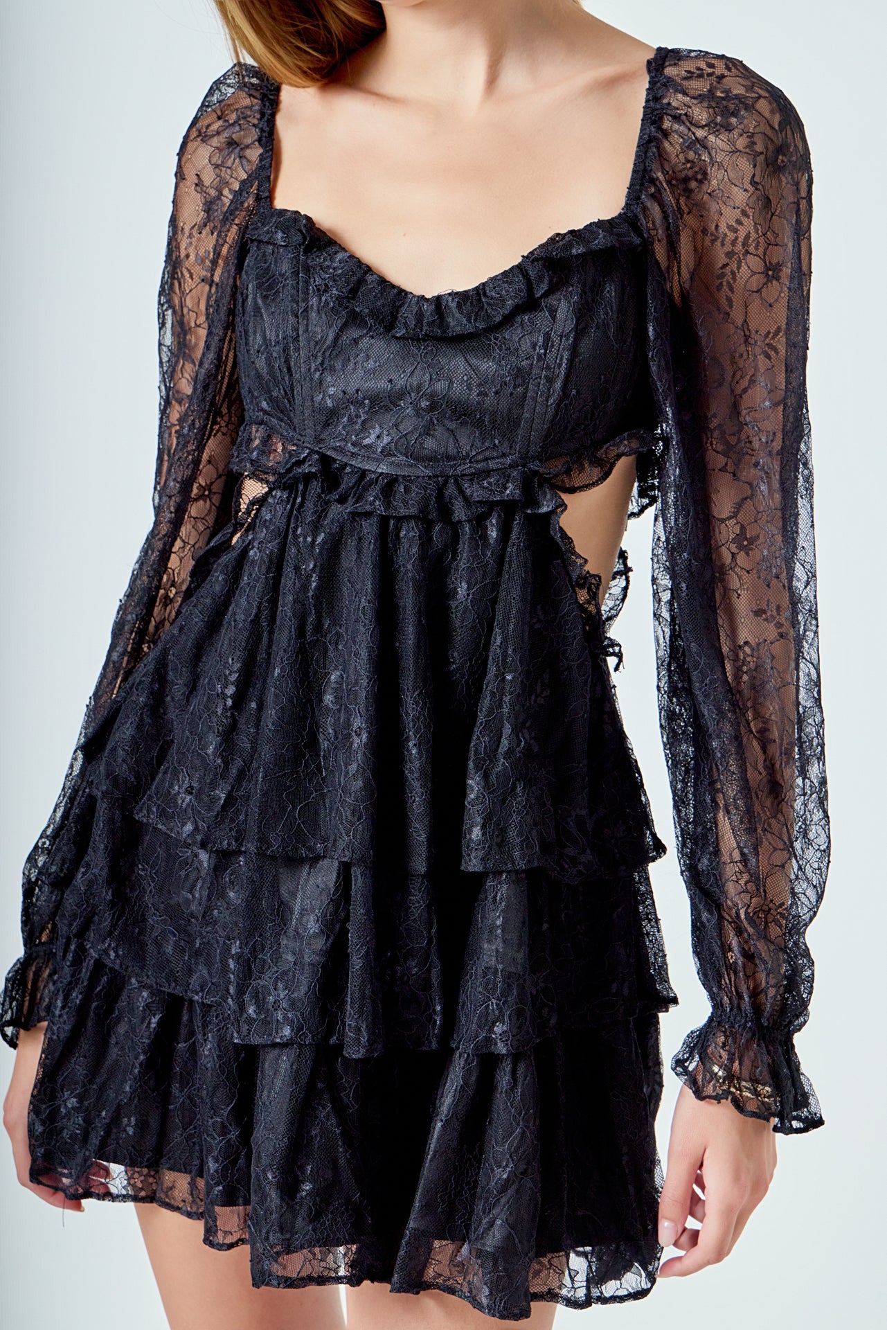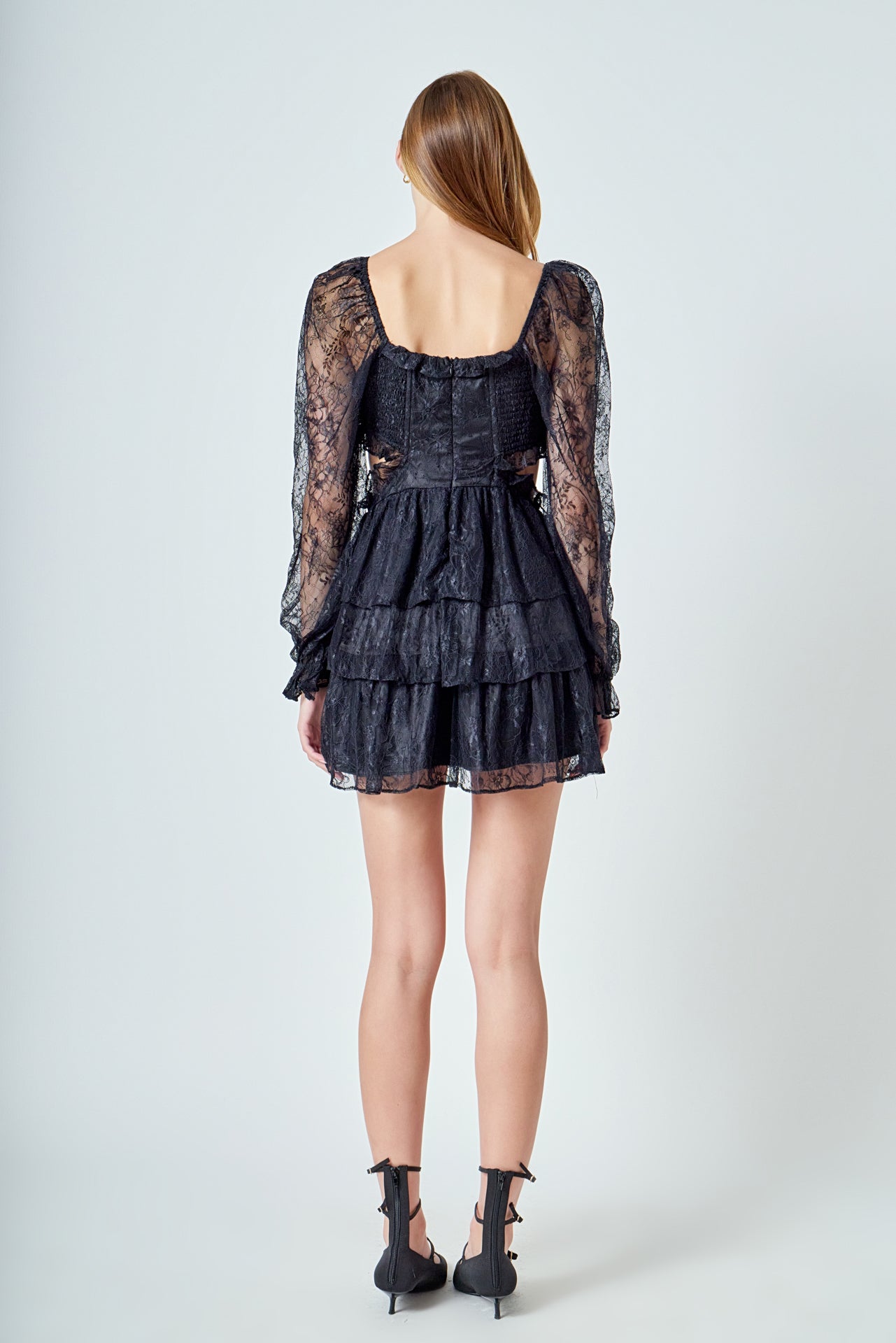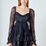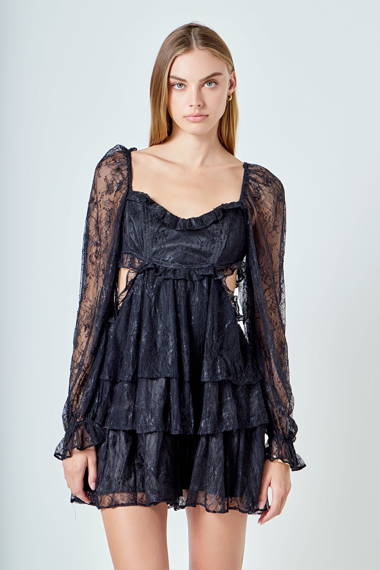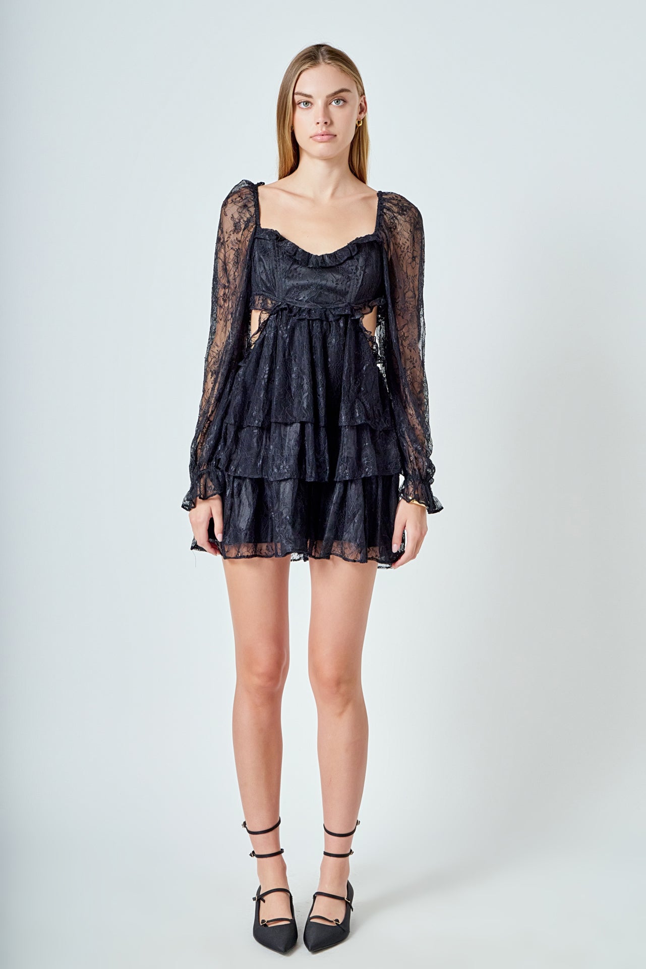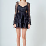 Crafted of intricate floral lace, this mini dress features long sleeves that are finished with ruffle detailing. The corset-style bust has a sweetheart neckline, and the tiered skirt is accentuated with waist cutouts.