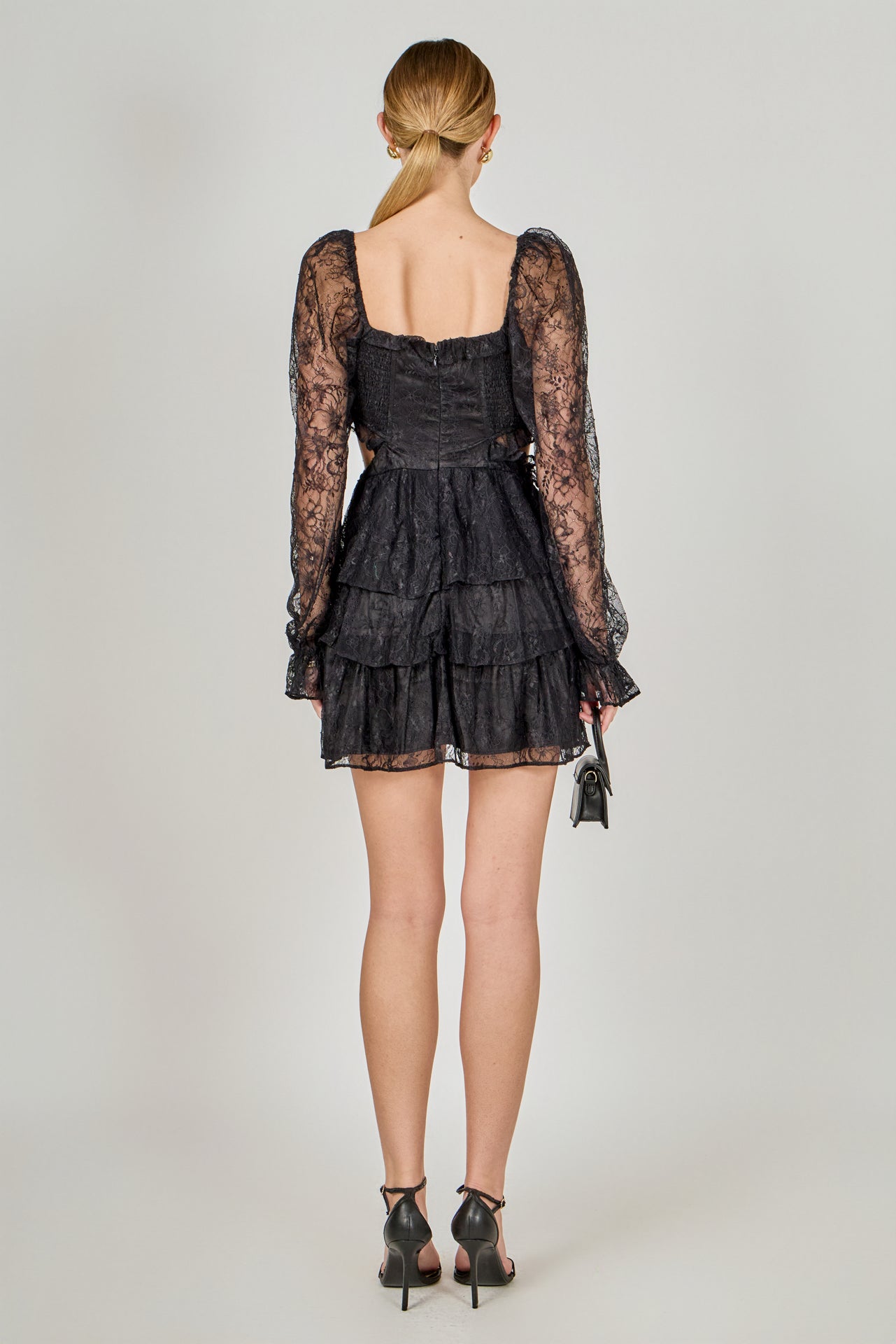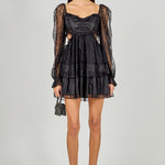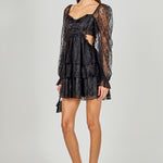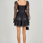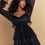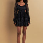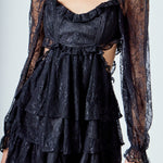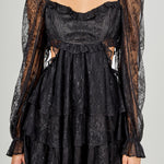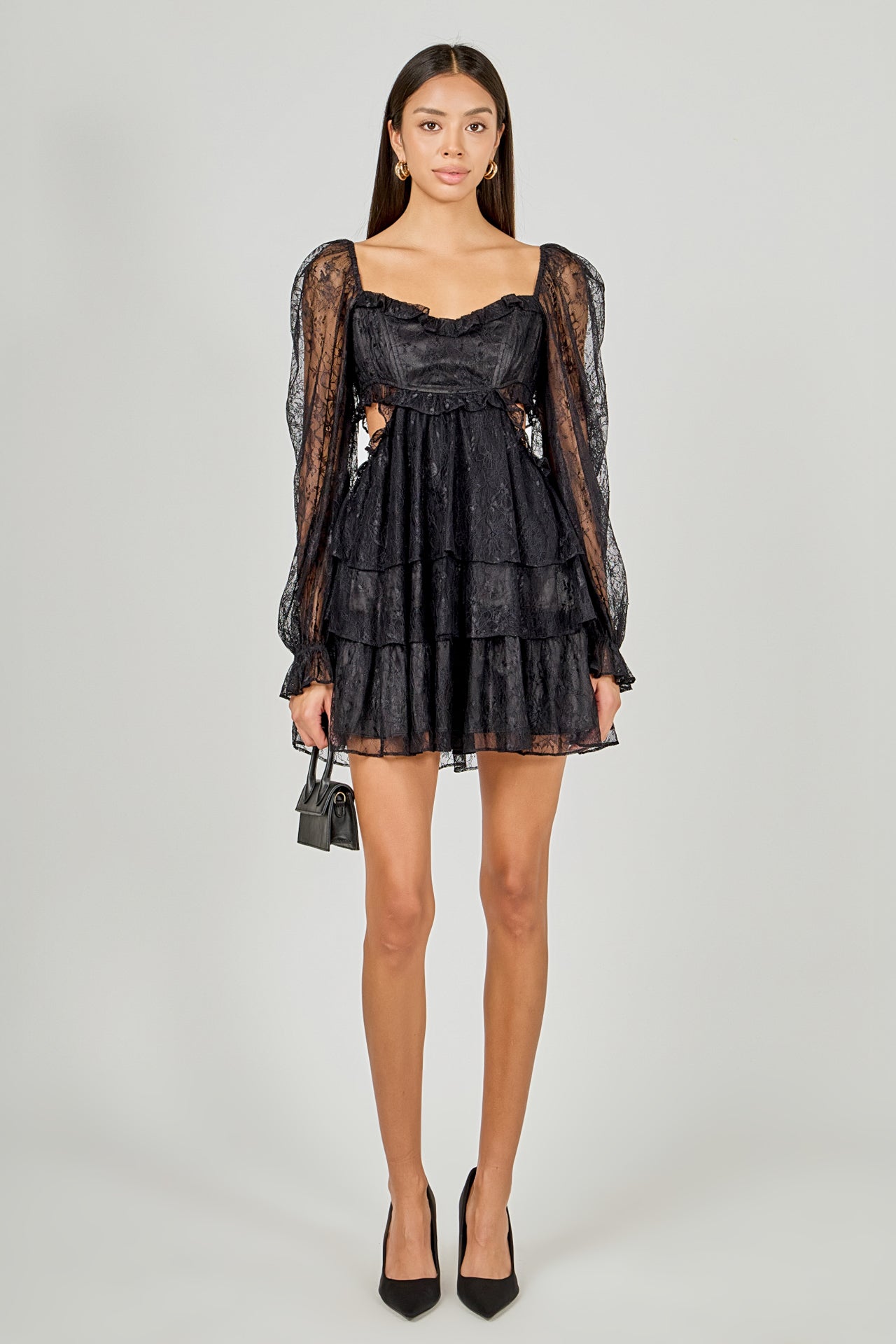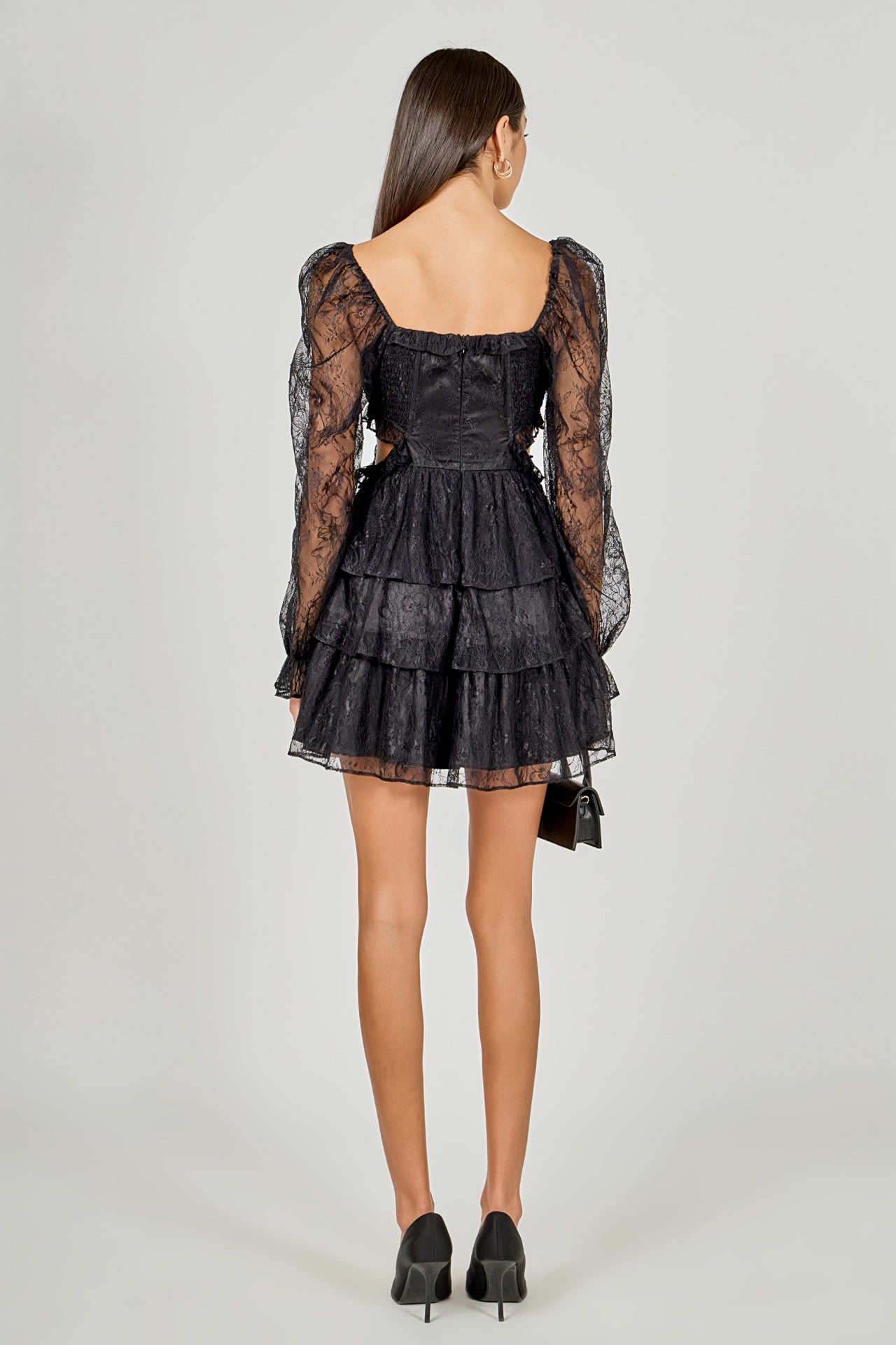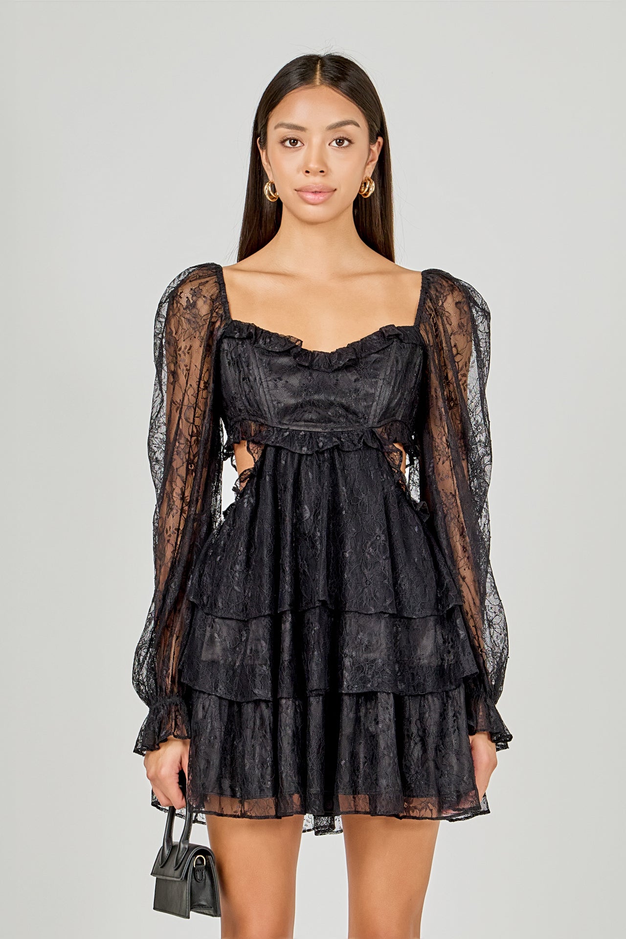 Crafted of intricate floral lace, this mini dress features long sleeves that are finished with ruffle detailing. The corset-style bust has a sweetheart neckline, and the tiered skirt is accentuated with waist cutouts.