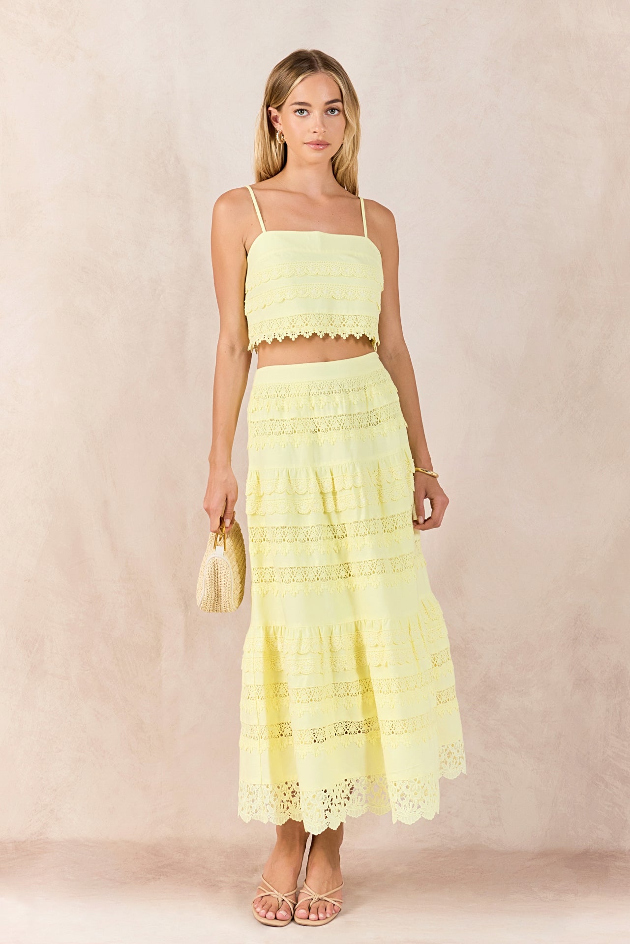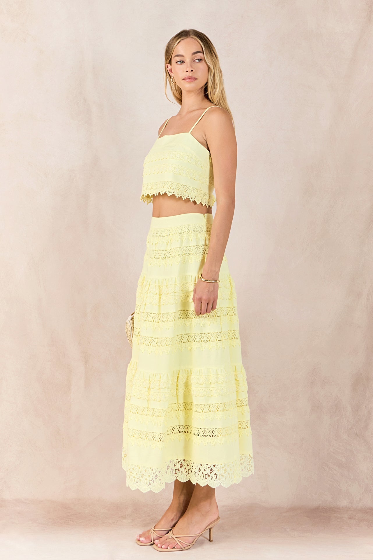 Elevate your wardrobe with the Laced Midi Skirt, an exquisite blend of delicate lace and structured woven fabrication. Its sophisticated midi length and sleek side zipper create a polished silhouette and easy wear that moves effortlessly from day to night. Feminine and refined, this skirt is a versatile statement piece designed to turn heads.