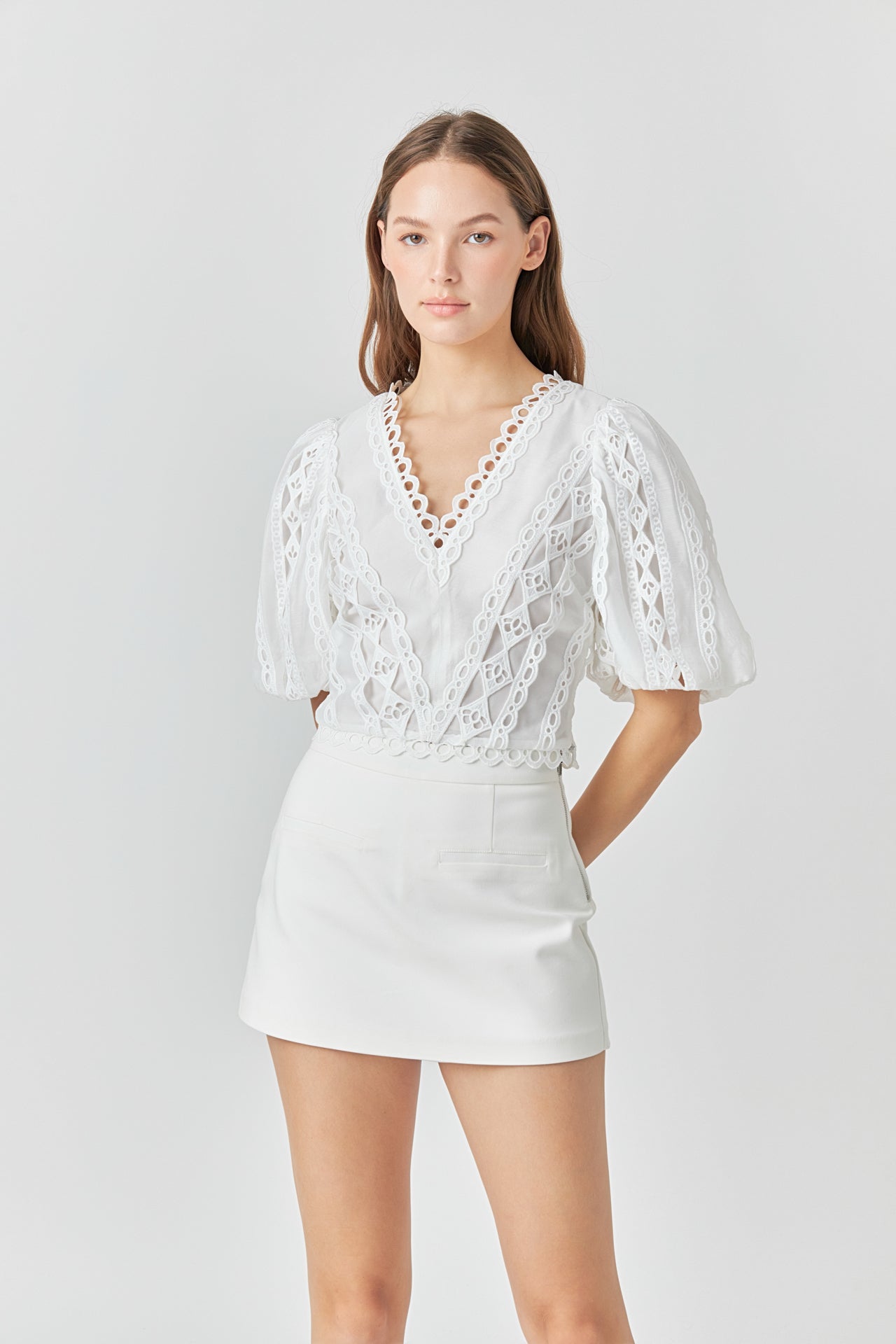 Laced V-Neck Puff Sleeve Top