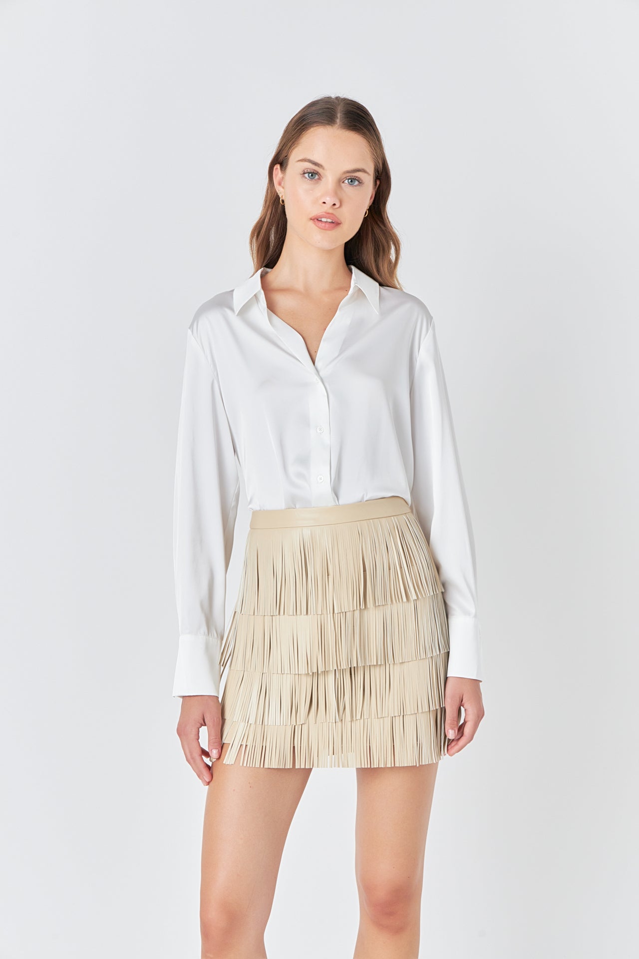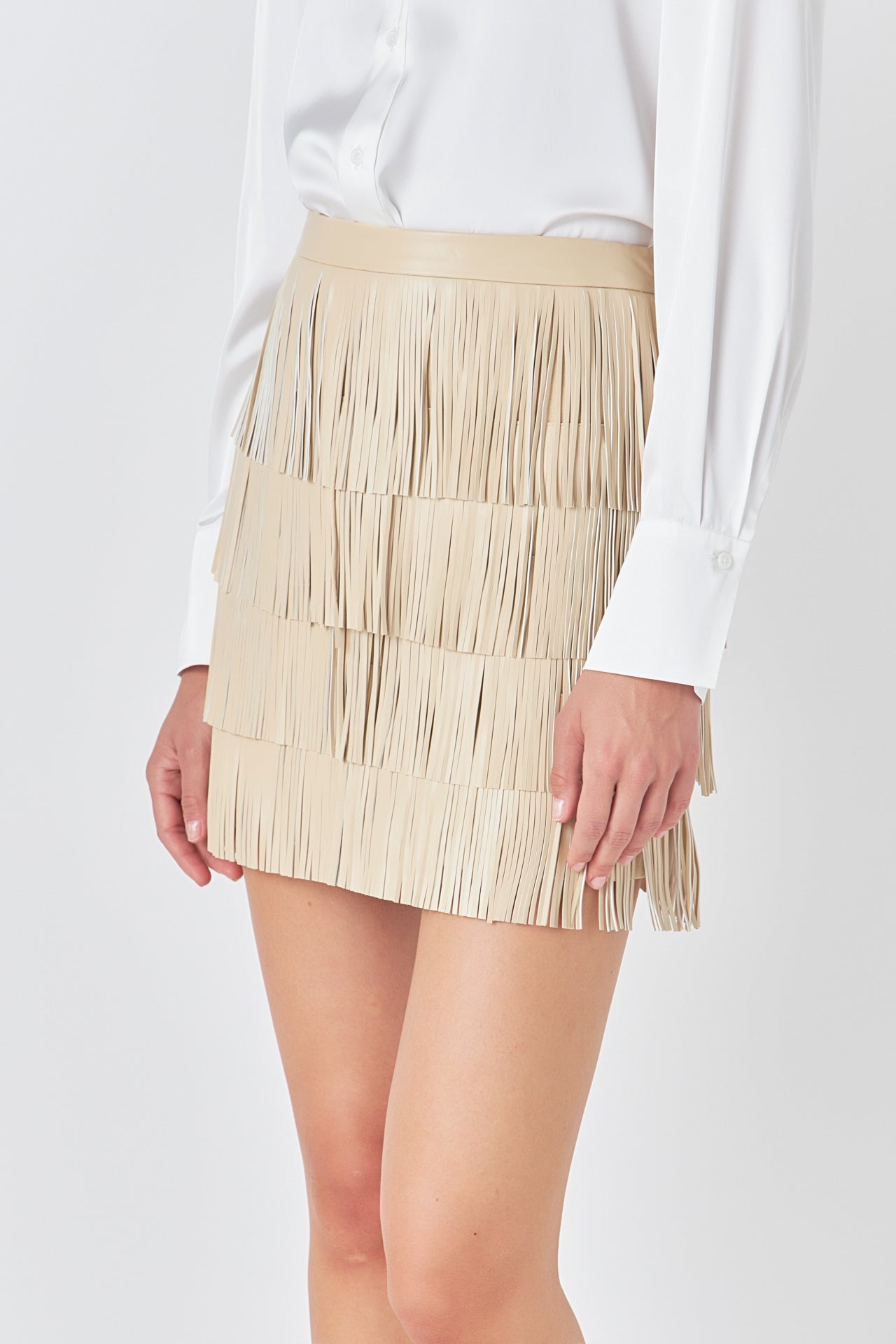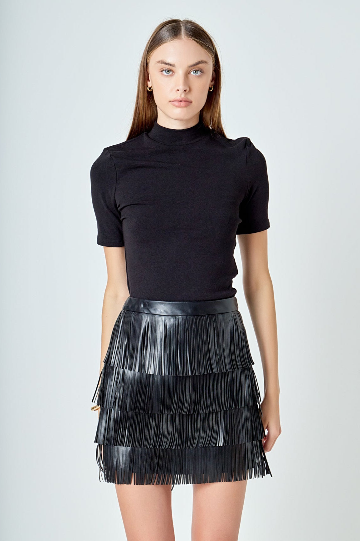 Accentuate and own your style with our Faux Leather Fringe Mini Skirt. The high waisted waist band and mini length make this skirt an absolute must-have. Equipped with fringe details this skirt is the perfect way to add a playful and chic flourish to any look. A unique piece sure to draw envy and compliments be the center of attention in this timeless wardrobe staple. Suitable for any occasion what are you waiting for? Get your Faux Leather Fringe Mini Skirt today!