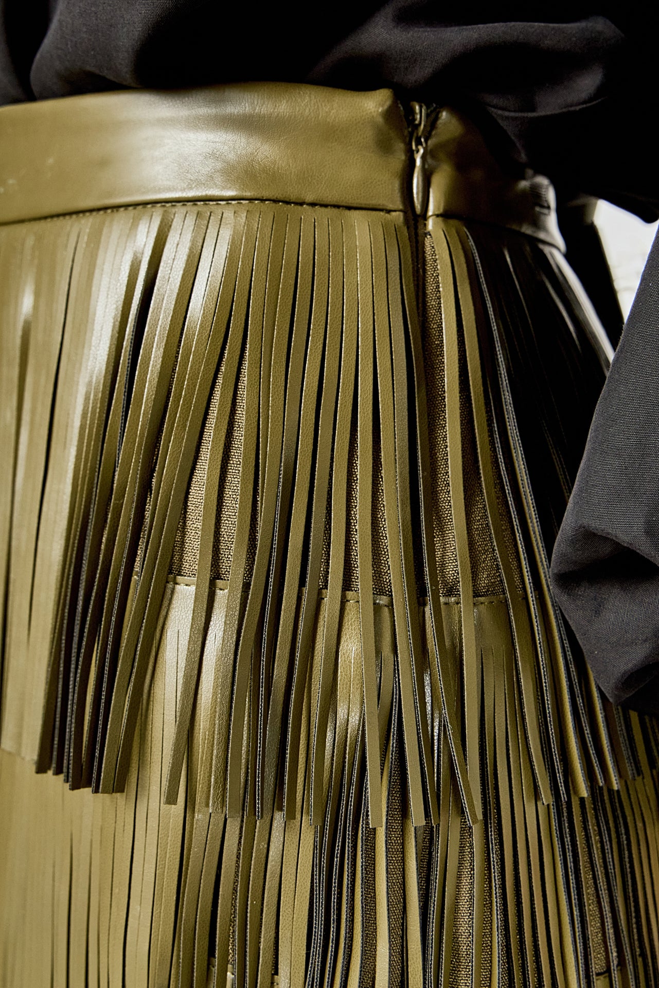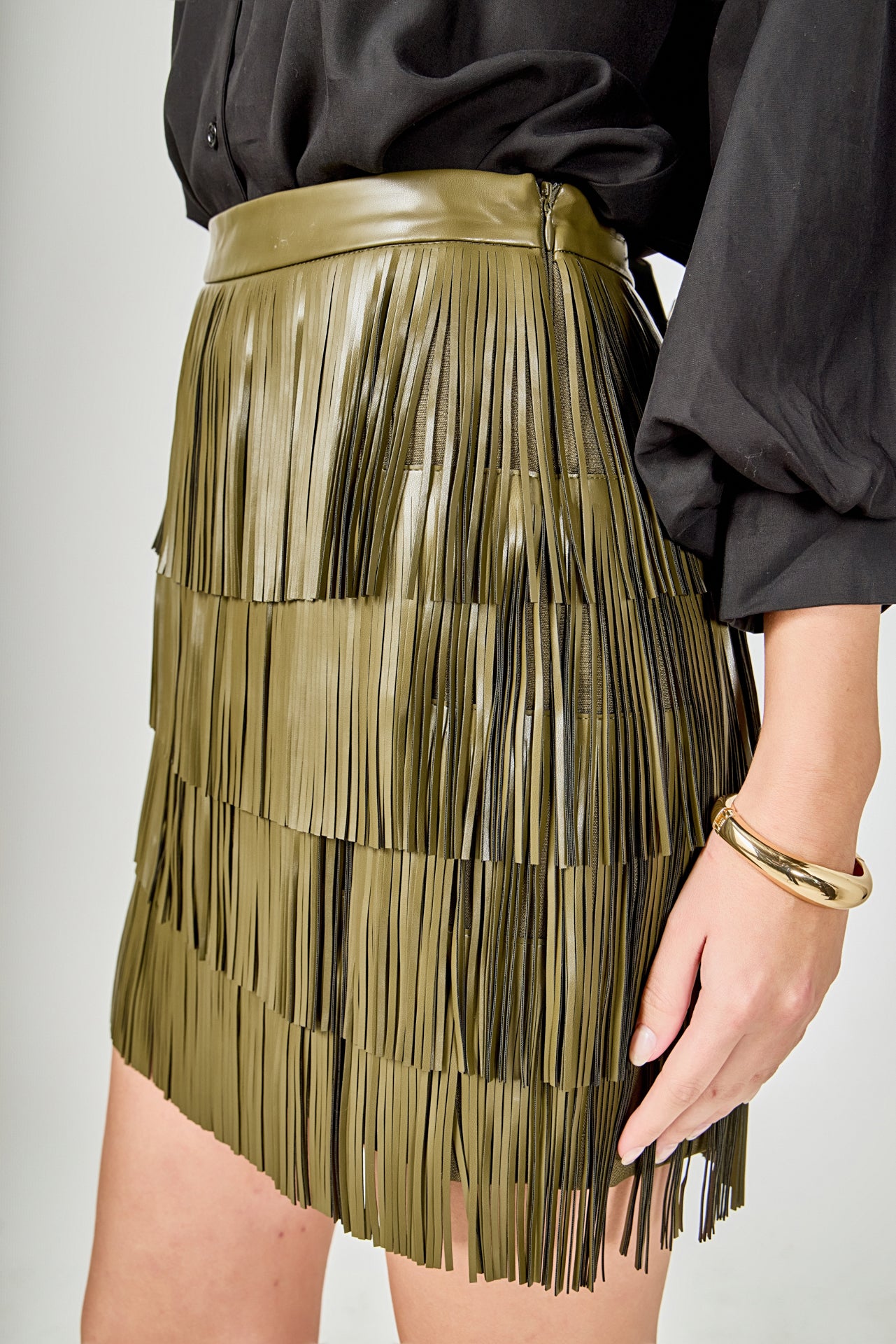 Accentuate and own your style with our Faux Leather Fringe Mini Skirt. The high waisted waist band and mini length make this skirt an absolute must-have. Equipped with fringe details this skirt is the perfect way to add a playful and chic flourish to any look. A unique piece sure to draw envy and compliments be the center of attention in this timeless wardrobe staple. Suitable for any occasion what are you waiting for? Get your Faux Leather Fringe Mini Skirt today!