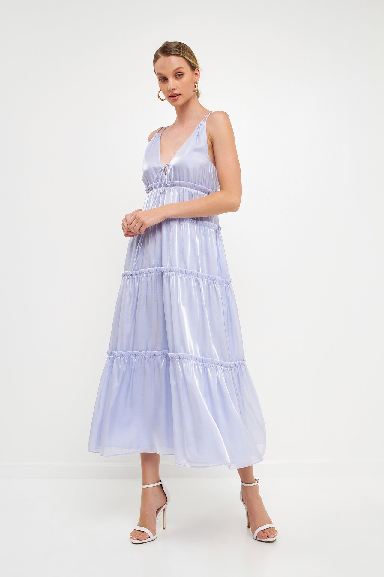 Turn heads in this gorgeous light sheen maxi gown. With a front tie detail and double spaghetti straps, this dress is both feminine and flattering. The ruffled tiers add a touch of whimsy, while the maxi length ensures you'll make a statement.