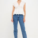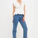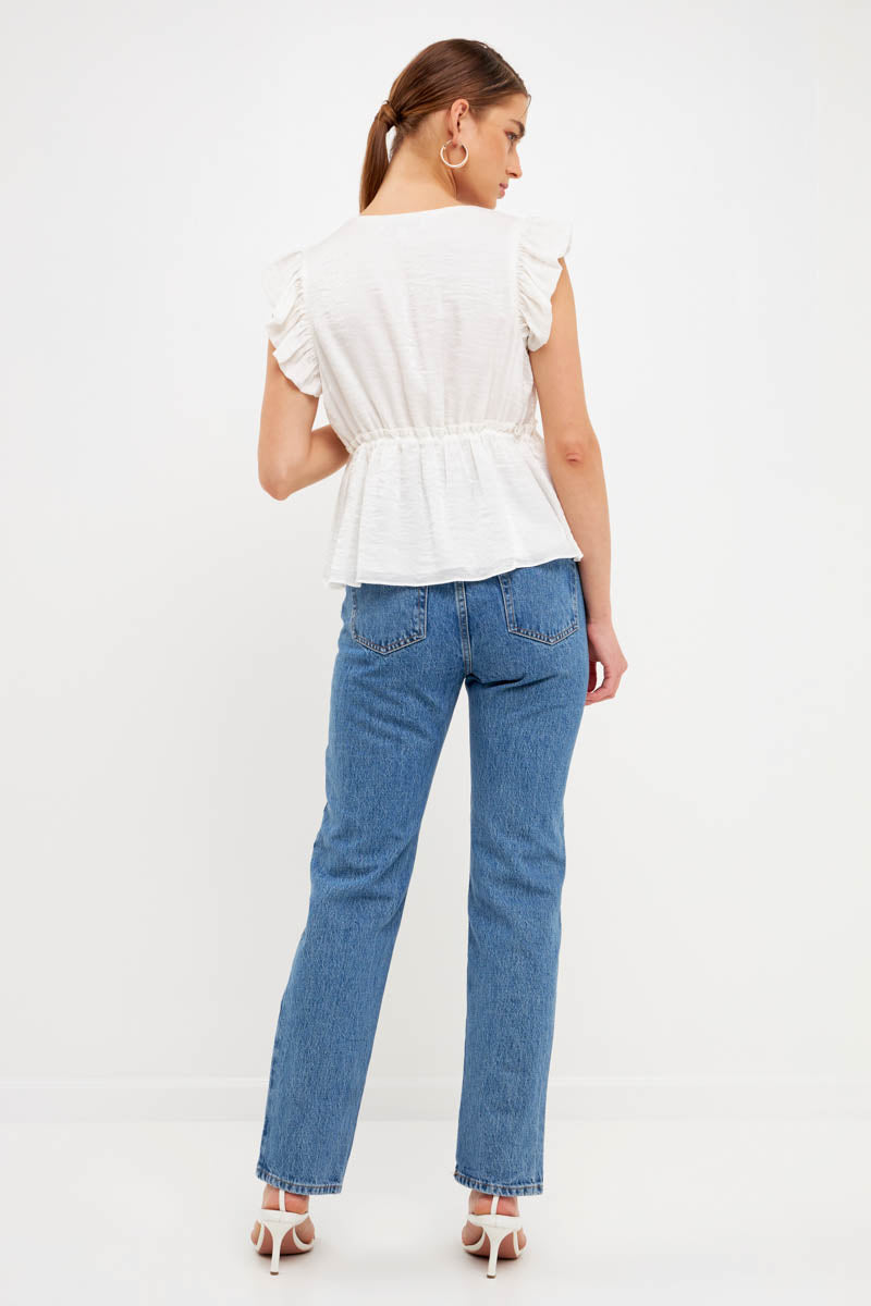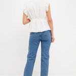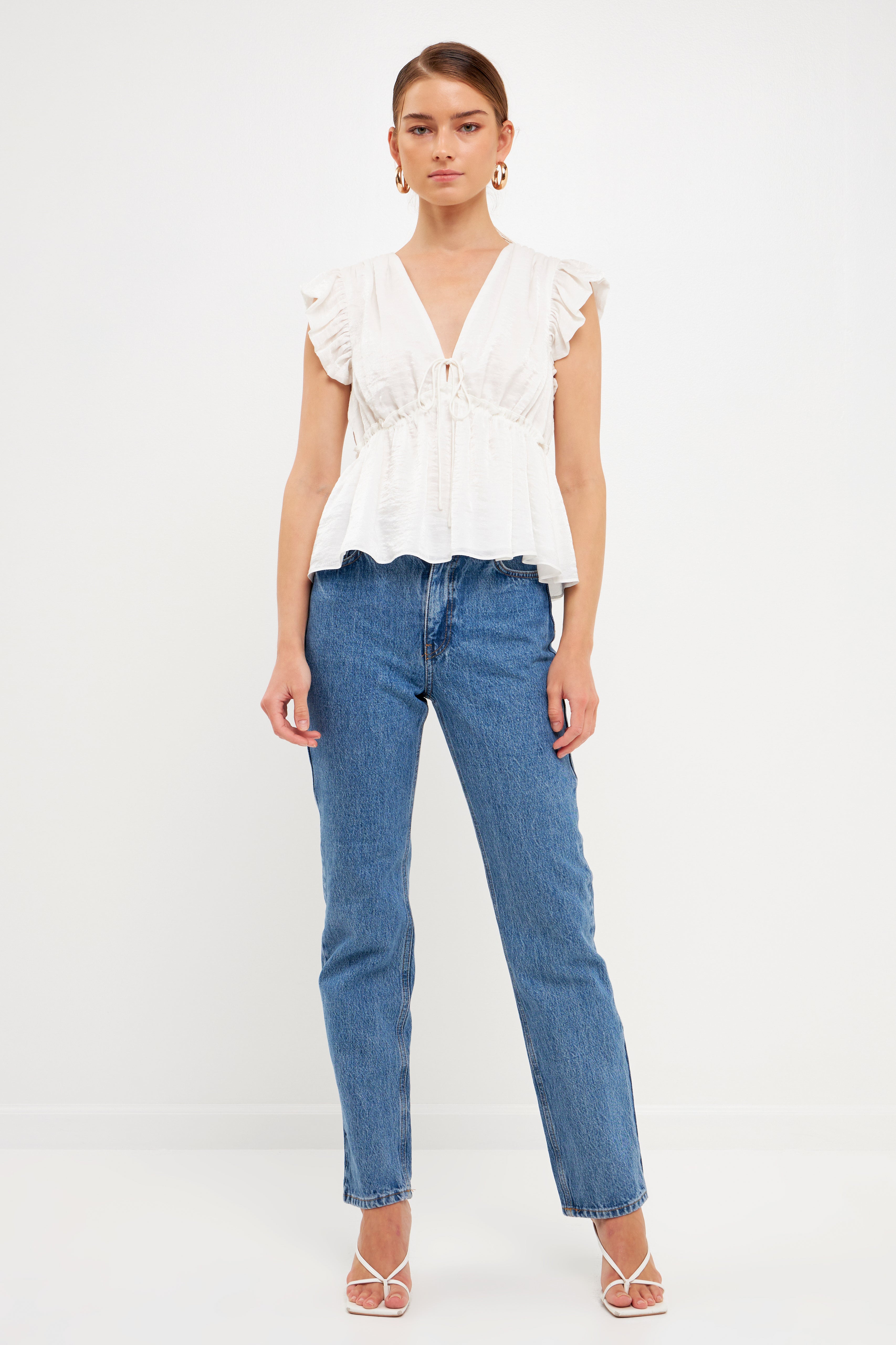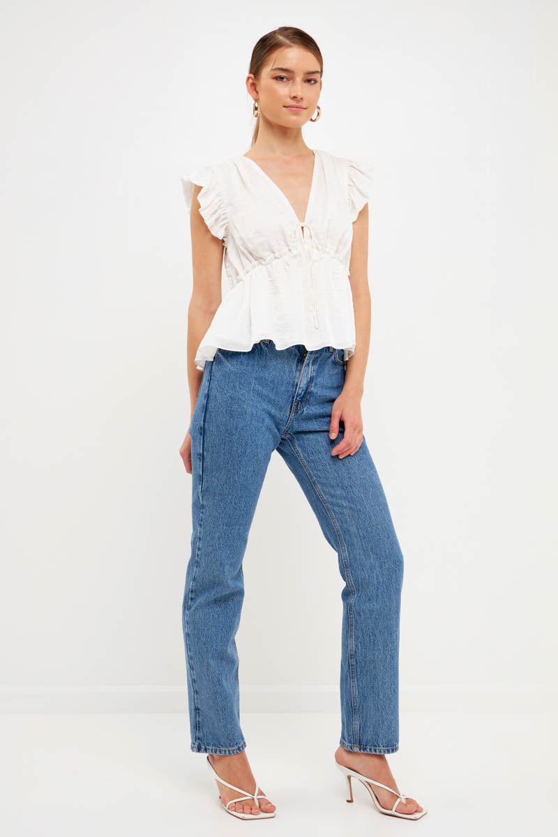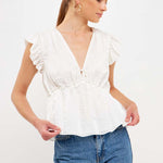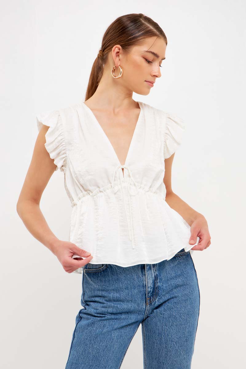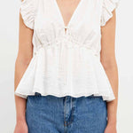 With a light speckled sheen, this top is sure to make you feel radiant. The front tie is functional and perfect for cinching in your waist on those hot summer days. Plus, the bubble ruffled shoulders add a touch of fun. Whether you're dressing it up or down, this top is sure to stun. Add it to your closet today.