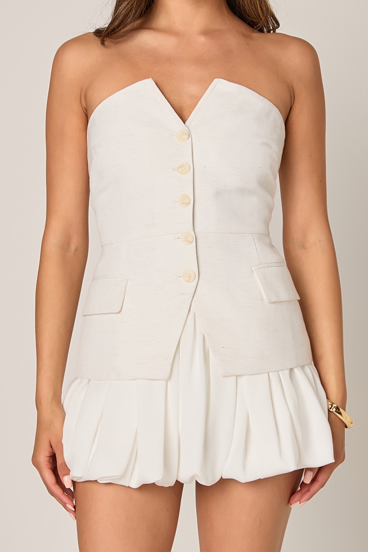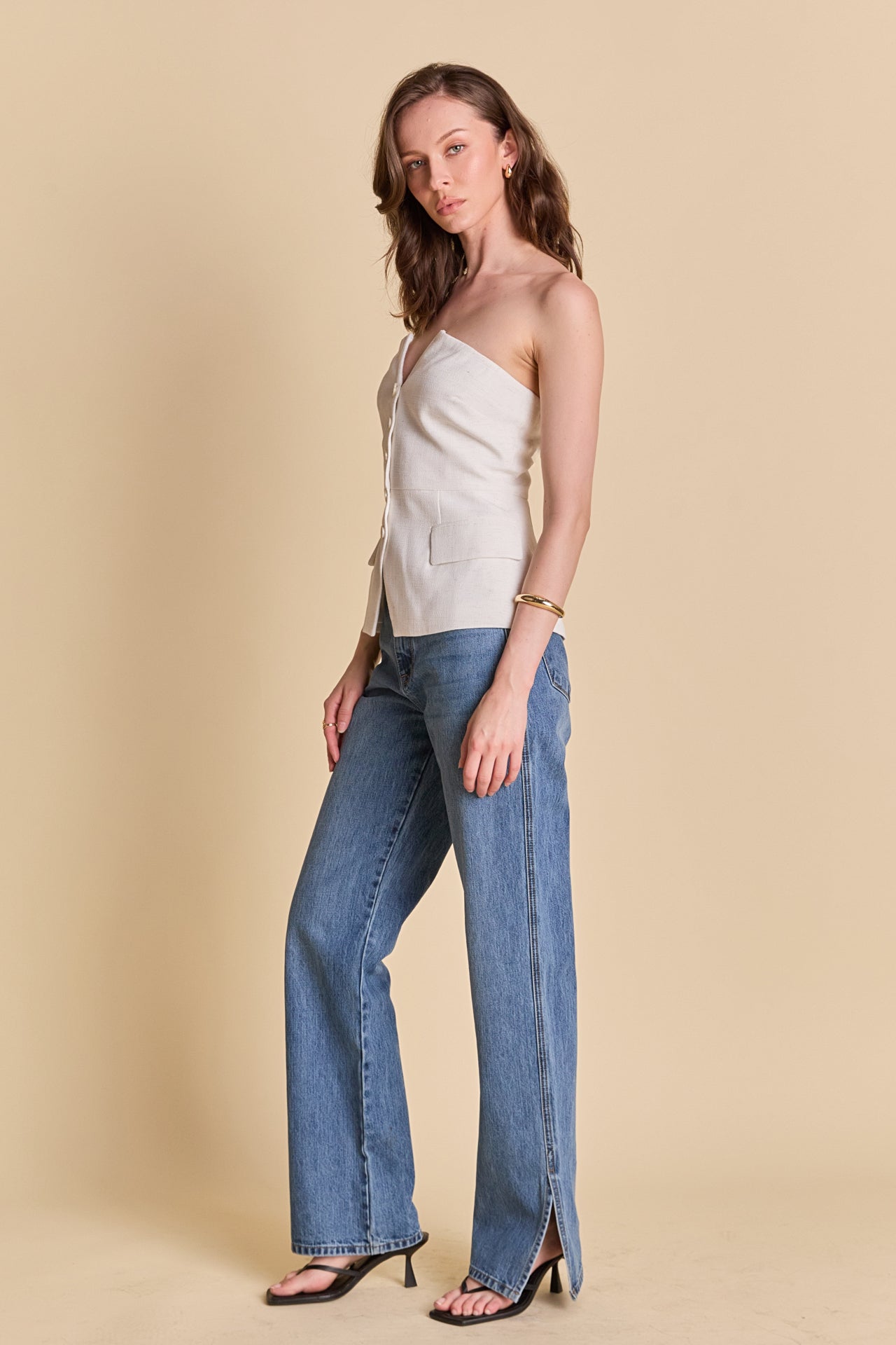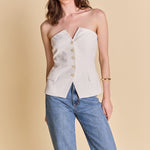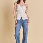 This must-have Linen Button Up Tube Top features a strapless design that shows off your sun-kissed shoulders. The fitted silhouette hugs your curves in all the right places while the front buttoned closure adds a touch of sophistication. Made from high-quality linen, this top is breathable and perfect for warm weather. And with its lining, you can confidently wear it all day long. A versatile piece that can be dressed up or down, this Linen Button Up Tube Top is a must-have for any fashion-forward wardrobe.